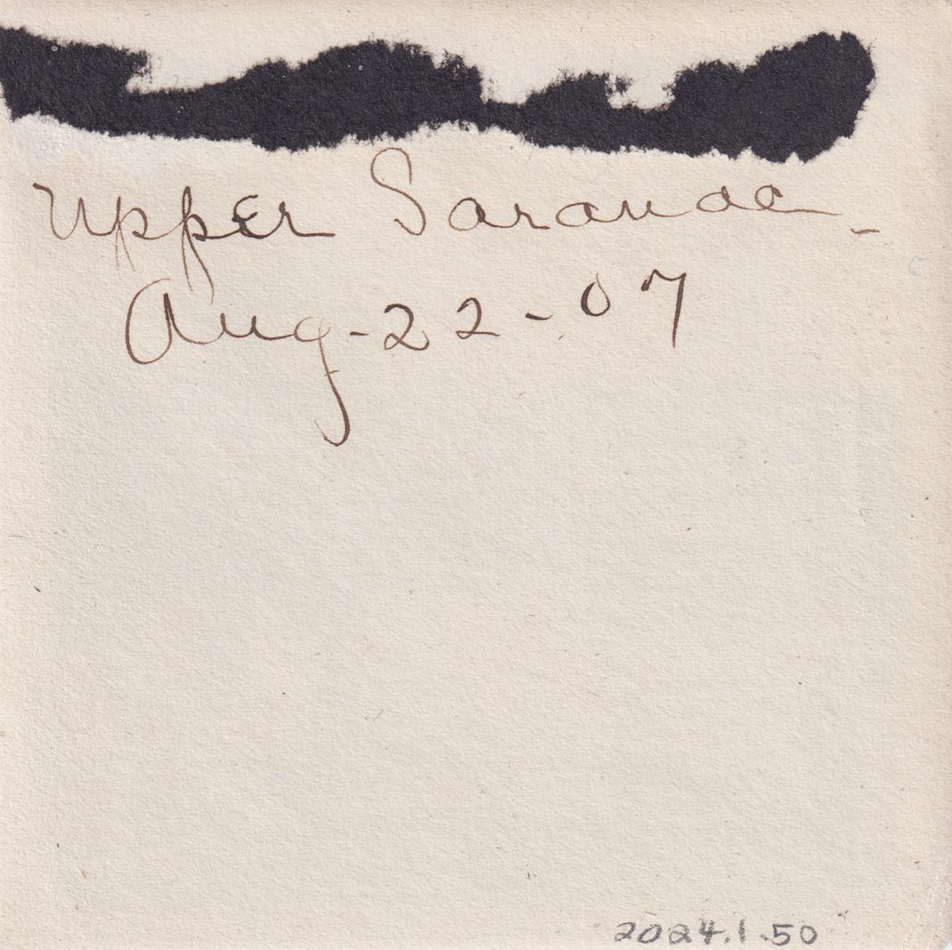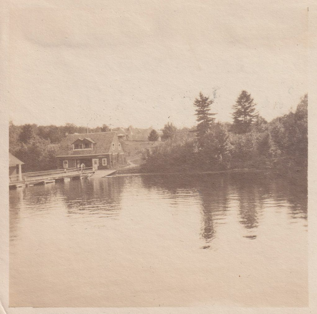 Black-and-White photograph showing a boathouse and dock on a body of water. Handwritten note on back reads, "Upper Saranac, Aug. 22, 07."