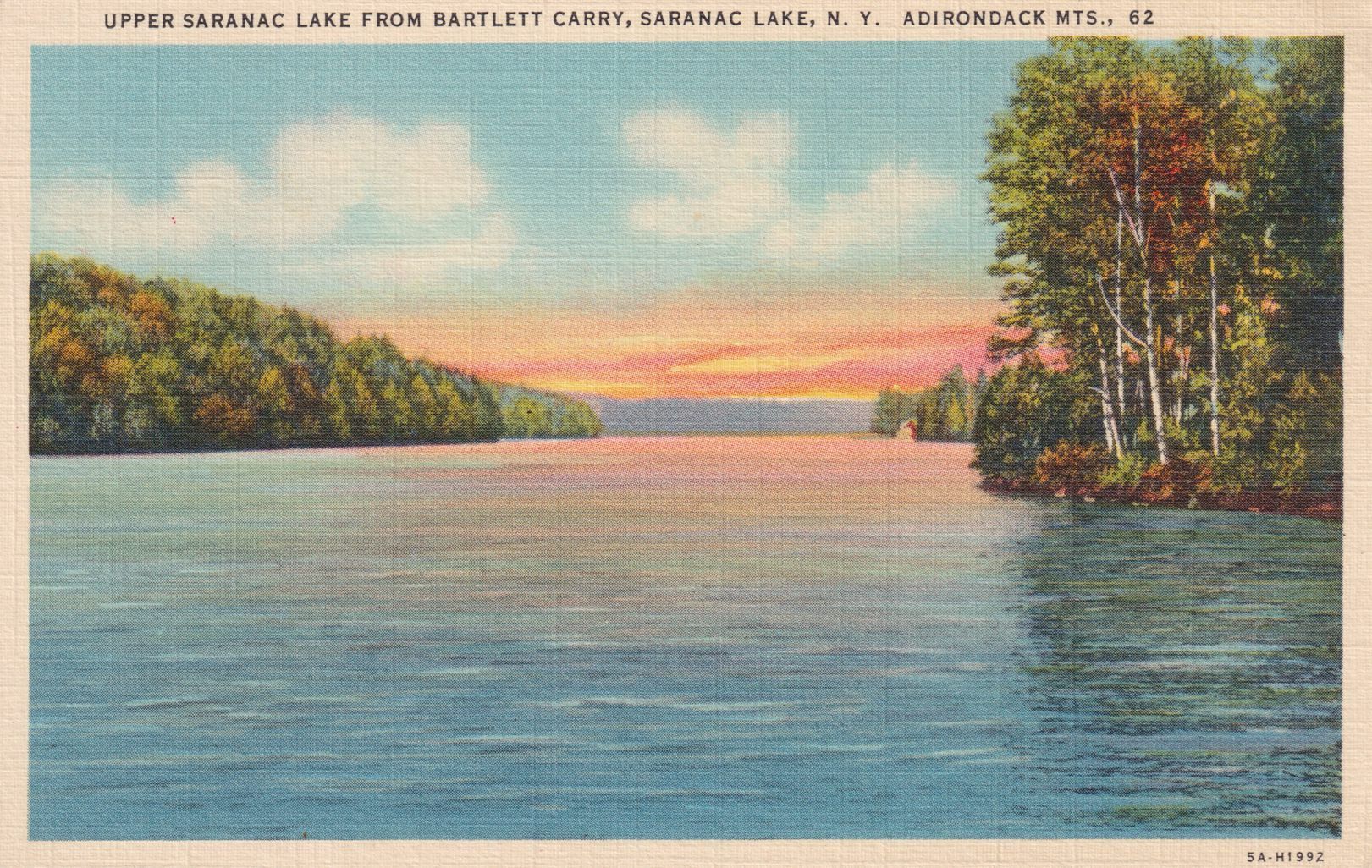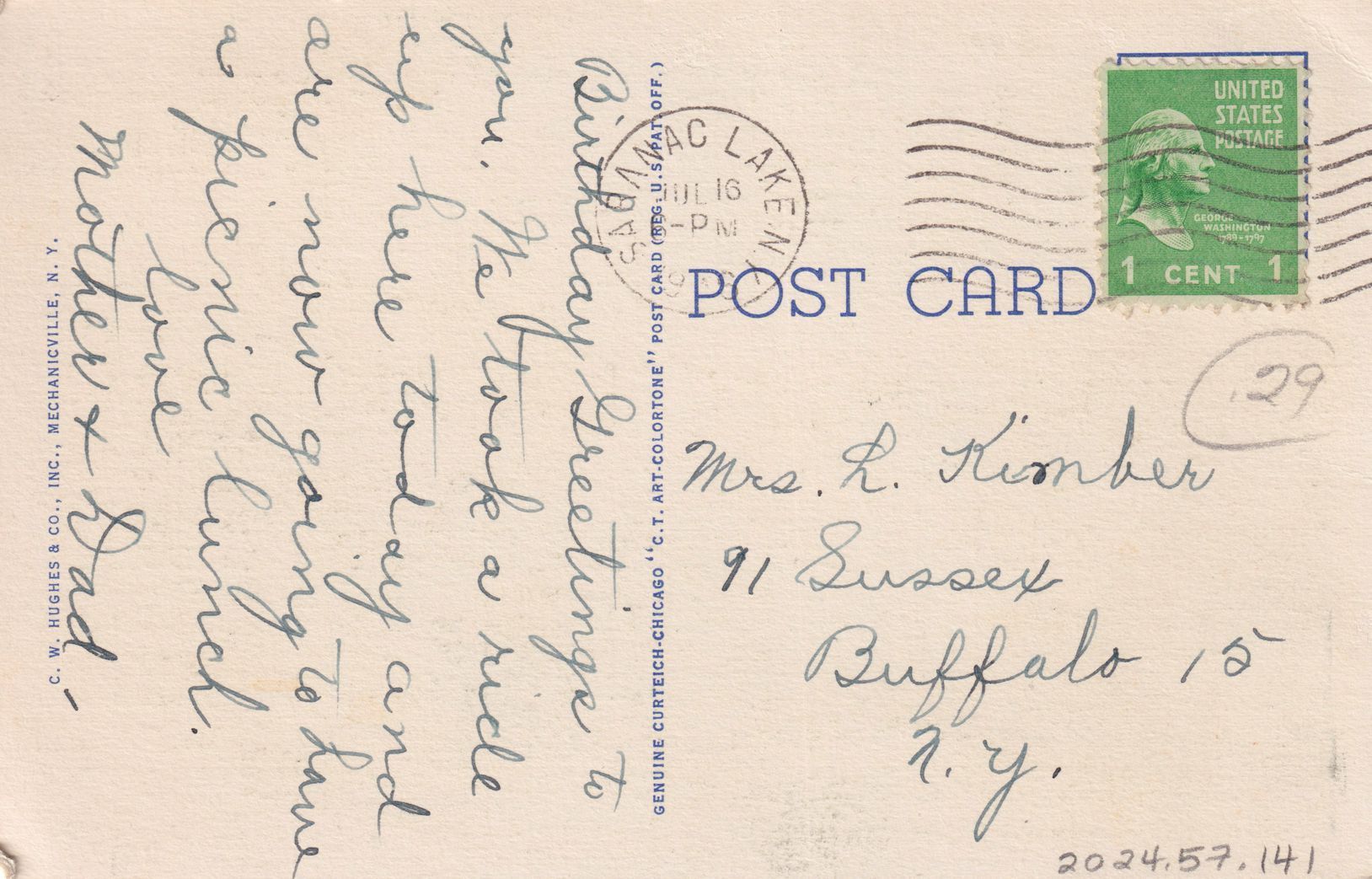 Color linen postcard showing a view of Upper Saranac Lake. Printed caption on front reads, "Upper Saranac Lake from Bartlett Carry, Saranac Lake, N. Y., Adirondack Mts." Printed by C. W. Hughes & Co., Inc., Mechanicville, NY. Used, divided back, white border, postmarked Saranac Lake, July 16, 1946. Handwritten message on reverse reads, "Birthday Greetings to you. We took a ride up here today and are now going to have a picnic lunch. Love, Mother + Dad." Mailed to Mrs. L. Kimber, 91 Sussex, Buffalo, NYSubject Place