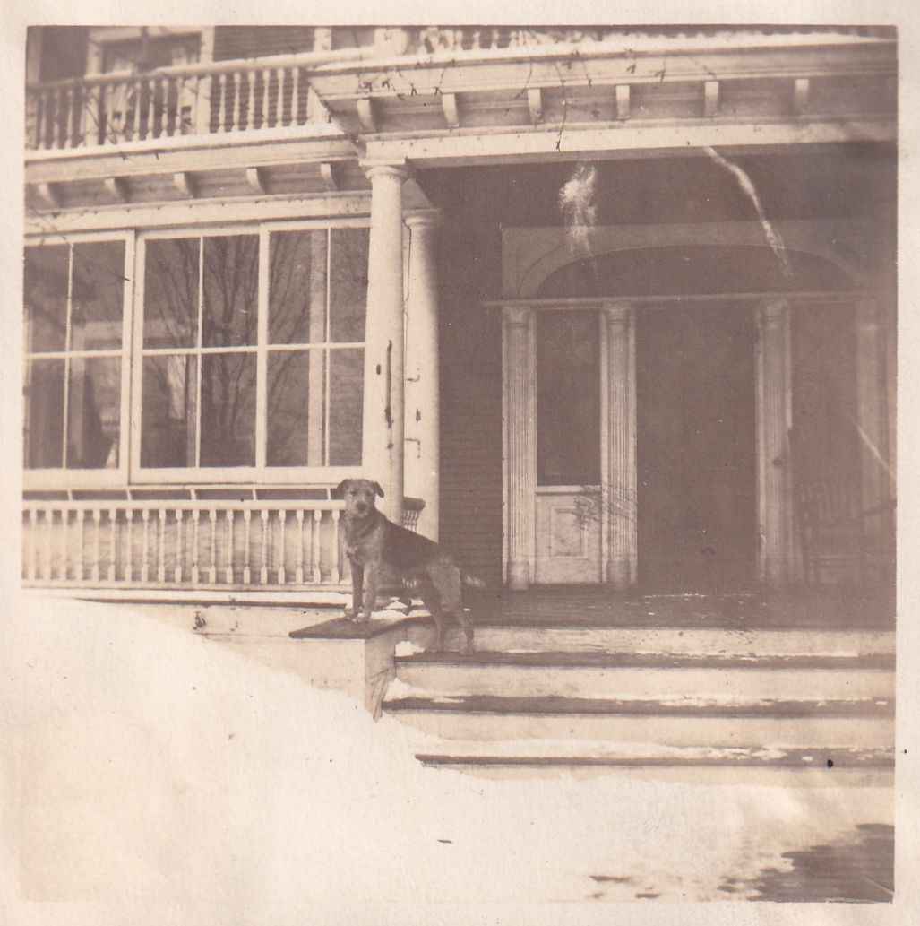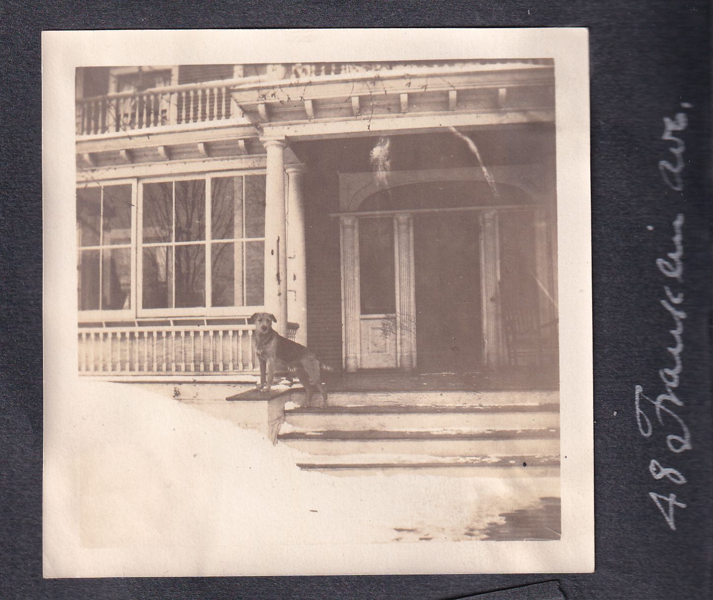 Photograph of dog standing on the front steps of 48 Franklin Avenue, AKA the Alta Vista Lodge. This was before the two buildings were joined. Snow is visible on the ground, and the front door and a portion of a cure porch are visible behind the dog. Album is 2020.2.1.Photograph Details