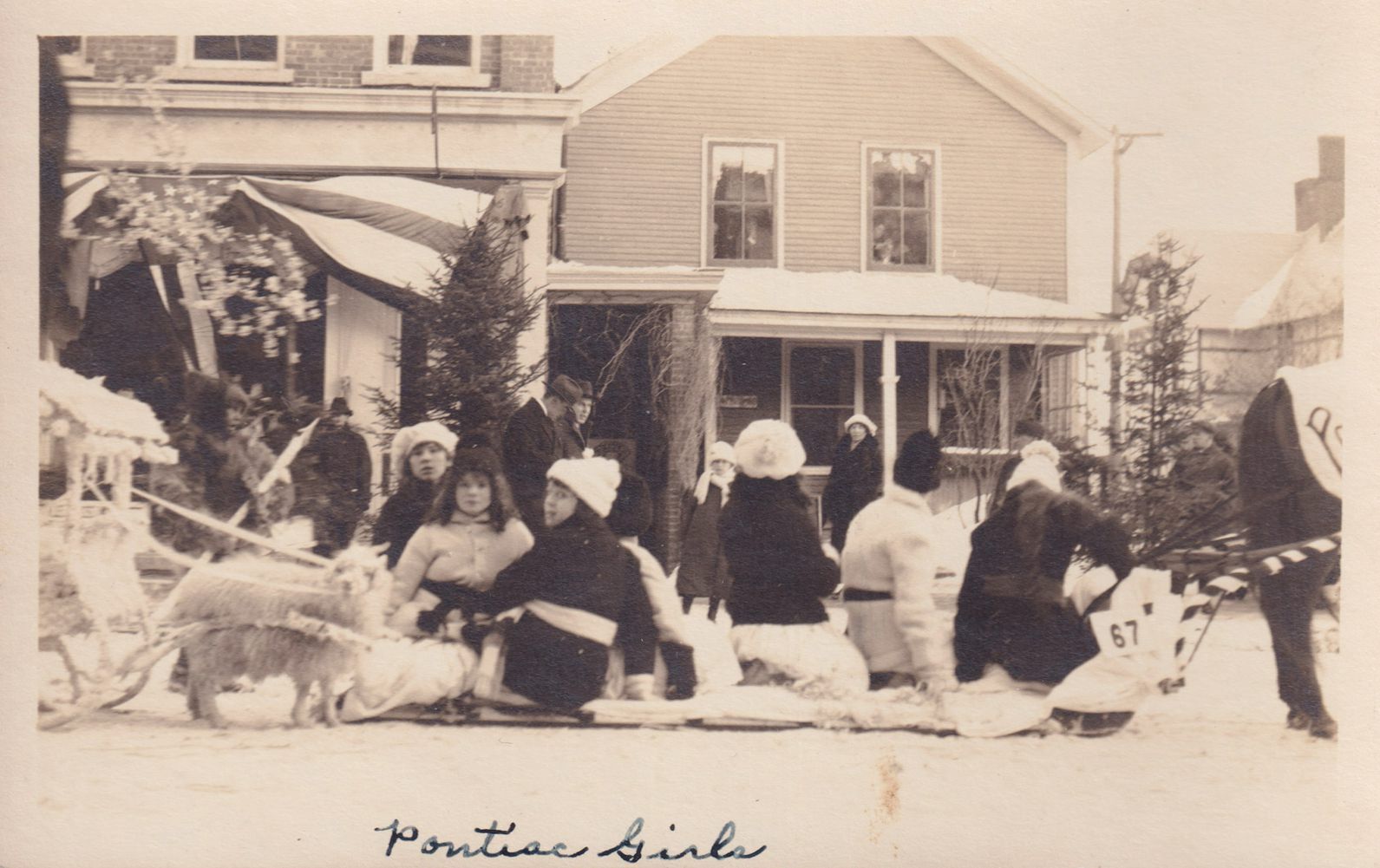 Postcard with a Kollecker photograph of a Winter Carnival parade float: a group of girls sitting on a sled. Handwriting beneath the photograph reads, "Pontiac Girls."
