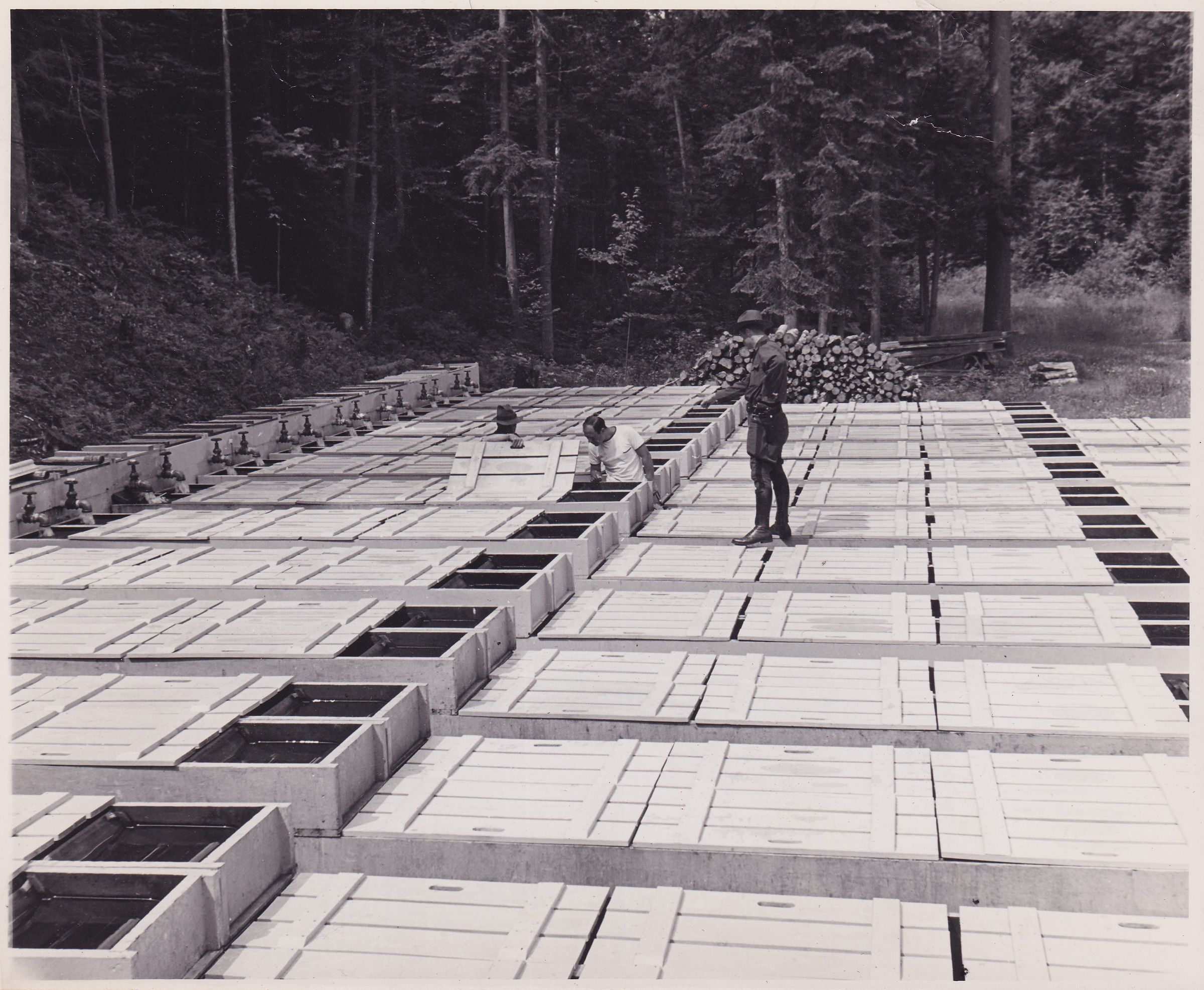 Black-and-White photograph of a man in a game warden uniform standing on tanks at a fish hatchery. He is pointing at a tank that two men are looking into.