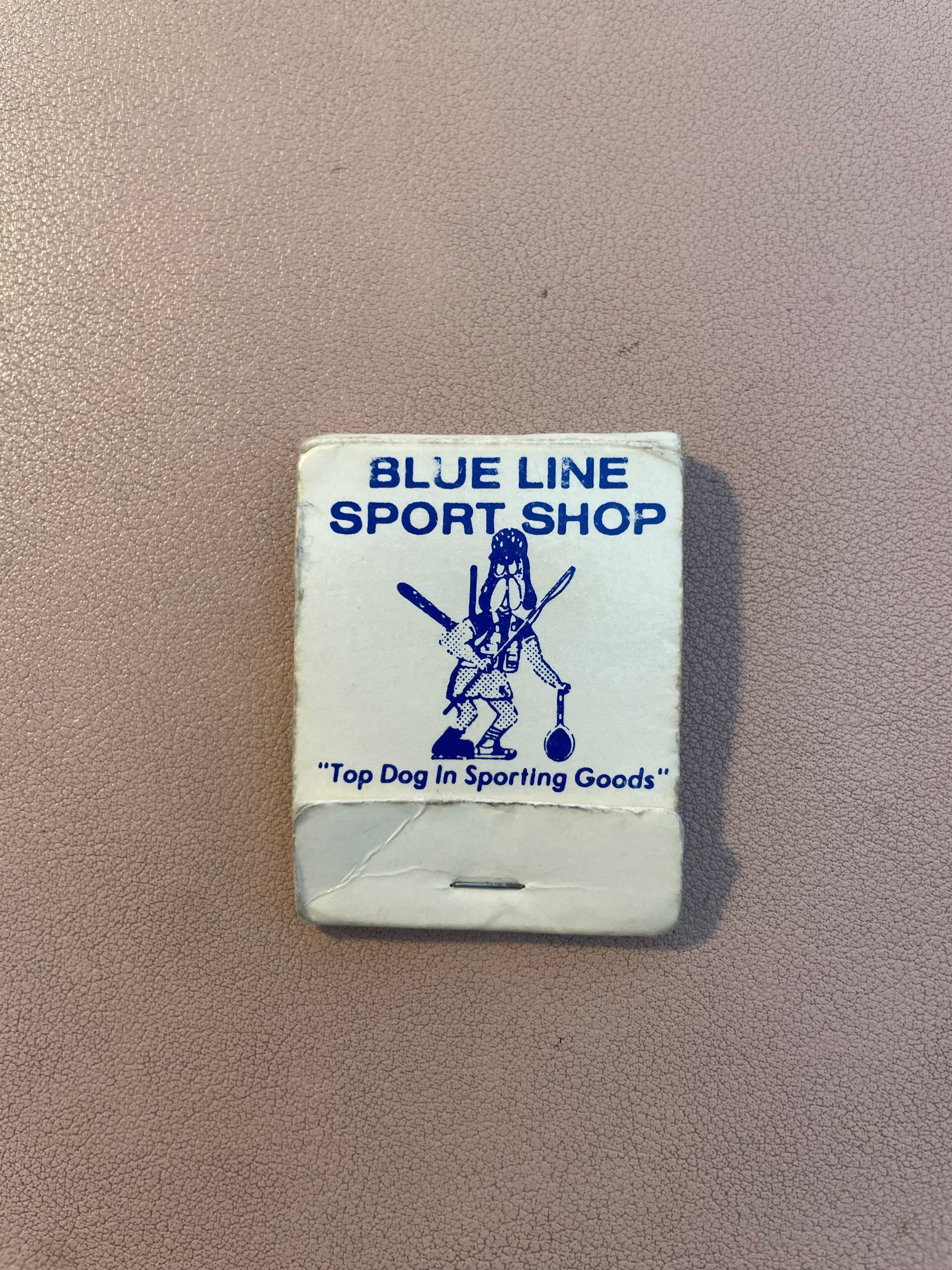 White matchbook advertising Blue Line Sport Shop. Cover reads, "Top Dog in Sporting Goods," with an illustration of a dog wearing sporting equipment. Reverse has contact information.