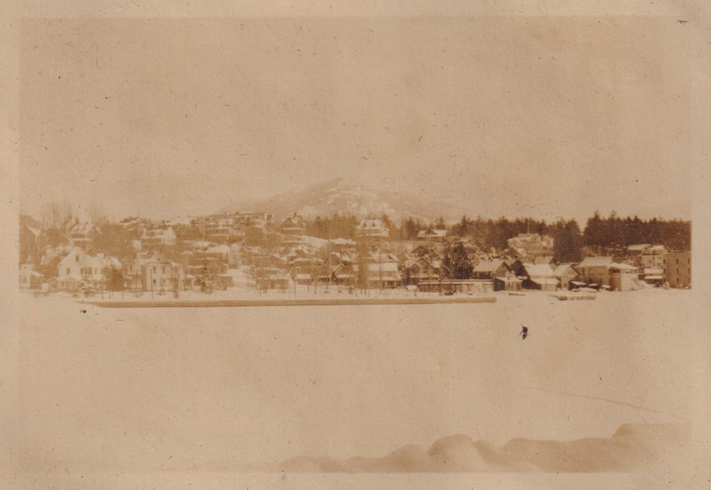 Black-and-White photograph looking northeast across a snowy Lake Flower. Houses can be seen on the opposite shore. Part of album 2024.21.1, kept by Amy Jones and David Blair Jones c. 1930-1934.