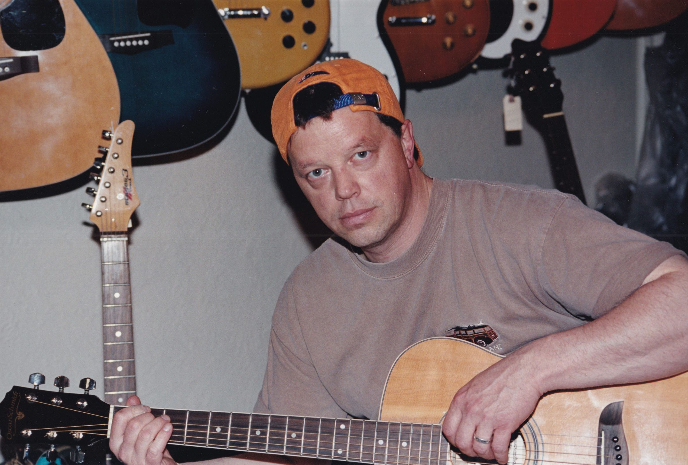 Color photograph of Mark Coleman in front of multiple guitars inside of his business, Ampersound. Portrait taken by Mary Lou Hanpeter Banks as part of her Soul Proprietor exhibition.