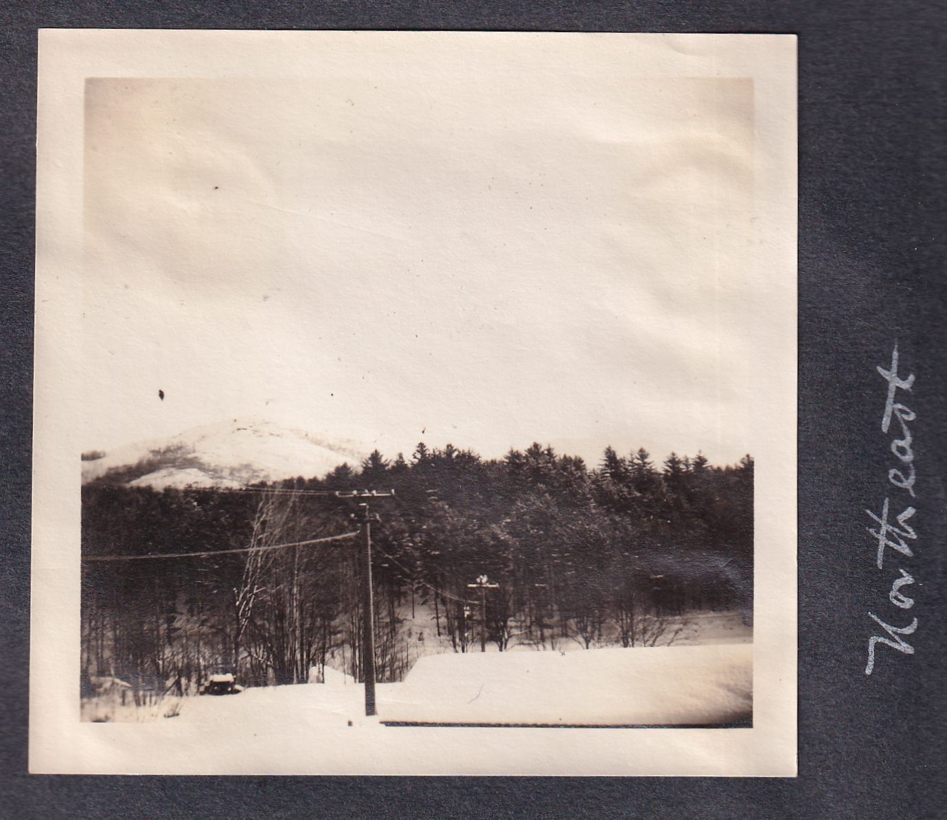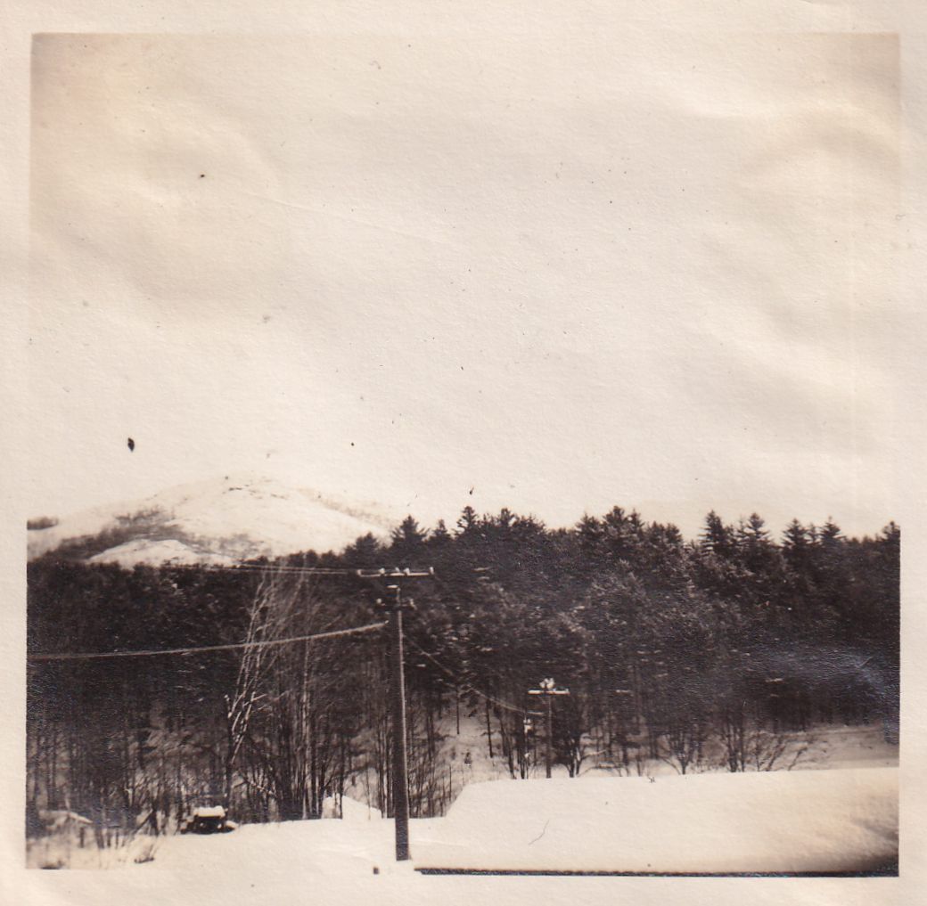 Photograph showing a snowy northeast view, likely from Franklin Avenue. Mt. Baker is visible in the background over some telephone poles and trees.