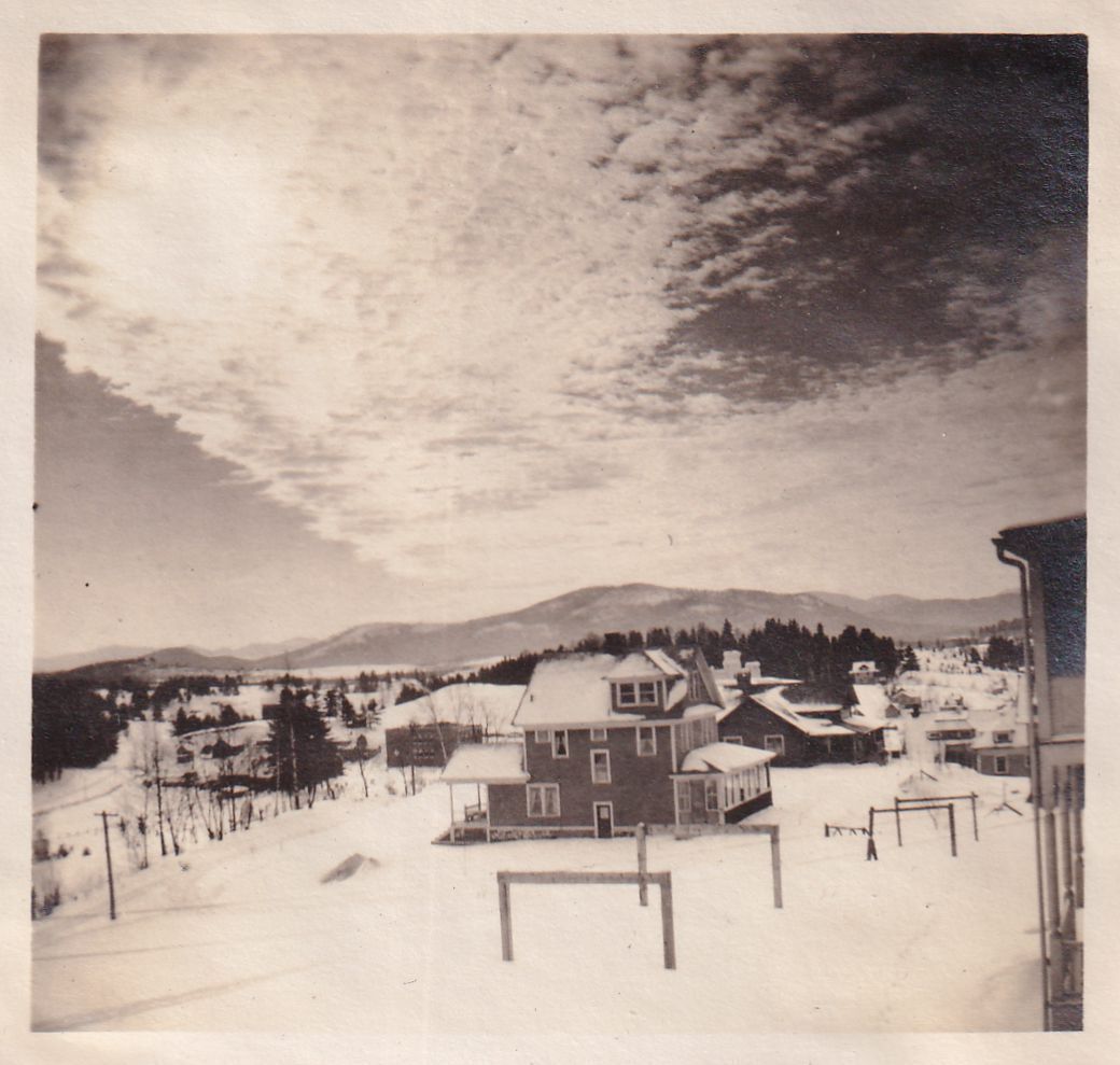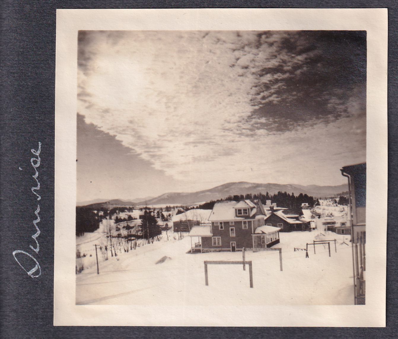 Photograph of the sunrise sky over cure cottages on Helen Hill, likely taken from a cure porch on the back of the northern building of the Alta Vista Lodge. The cottage at 39 [71] Clinton Avenue, where Adelaide Crapsey would cure in 1913, is visible at the center-left. Next to it is the cottage at 37 [61] Clinton Avenue. A portion of the cure porch at the southern Alta Vista Lodge building is visible at right. The Ice Palace, then built on Slater Hill, is visible in the distance over the roof of 37 Clinton Avenue. The back side of the River Street School is visible over the left-hand porch of 39 Clinton Avenue.Photograph Details