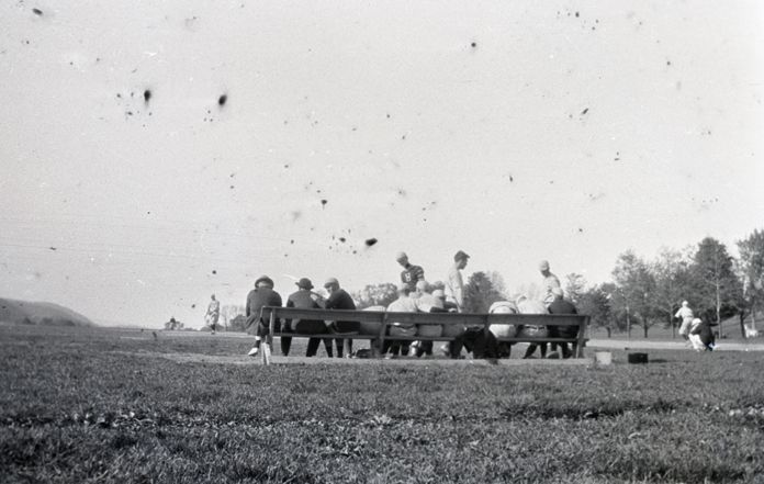 Negative of a group of baseball players sitting on a bench, photographed from behind. A pitcher, catcher, and umpire can be seen in the background. Most likely taken by Henry Ives Baldwin. This item is not fully cataloged but has been uploaded so the image is publicly available; if you would like us to prioritize cataloging this item, please contact the HSL Collections team.