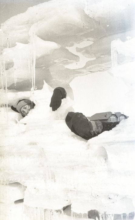 Negative of an unidentified person situated in a hole in a wall of ice bricks, most likely part of the Winter Carnival Ice Palace. Most likely taken by Mary Ives Baldwin. This item is not fully cataloged but has been uploaded so the image is publicly available; if you would like us to prioritize cataloging this item, please contact the HSL Collections team.