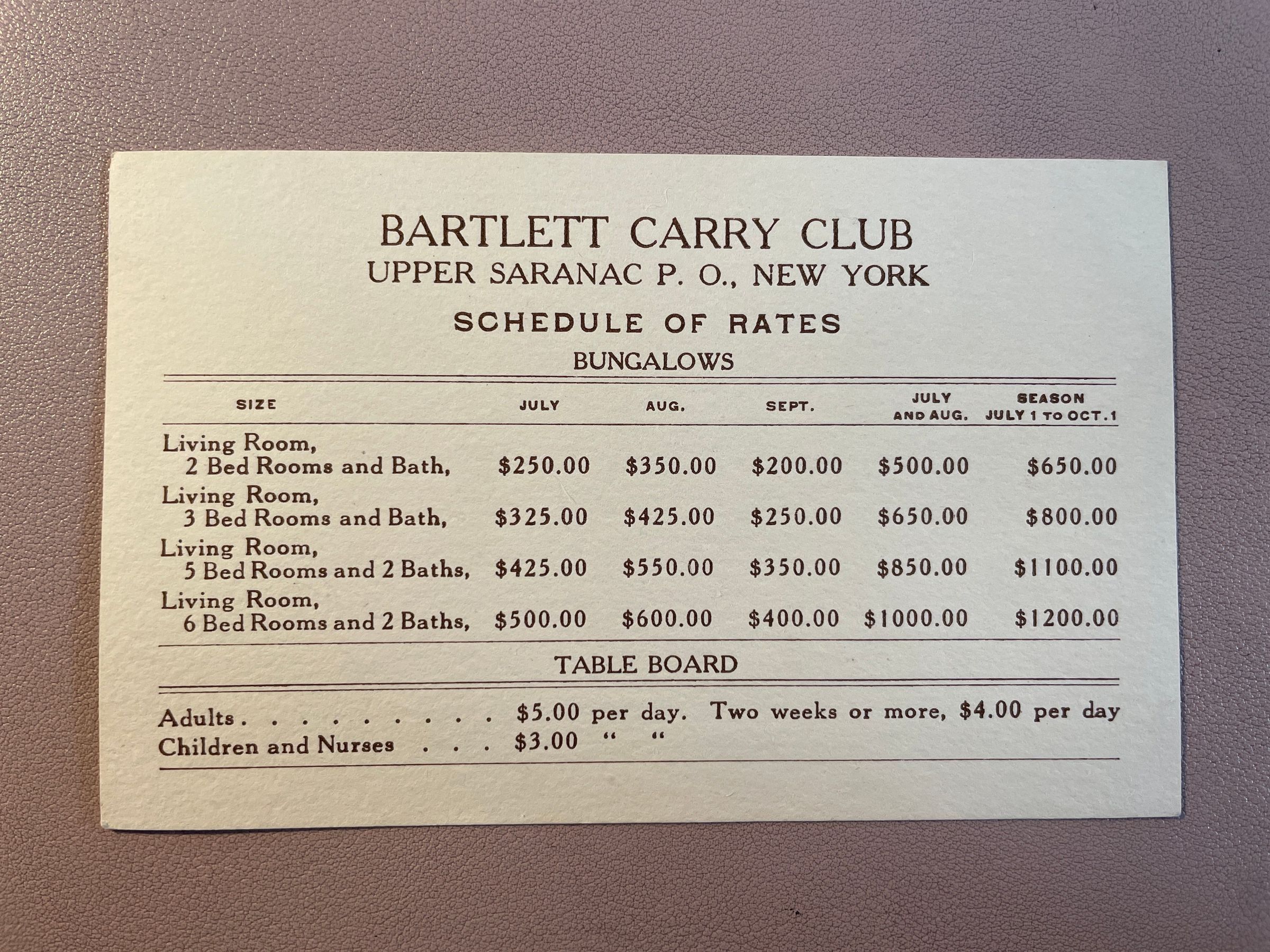 Card advertising rates for the Bartlett Carry Club, undated.Lexicon