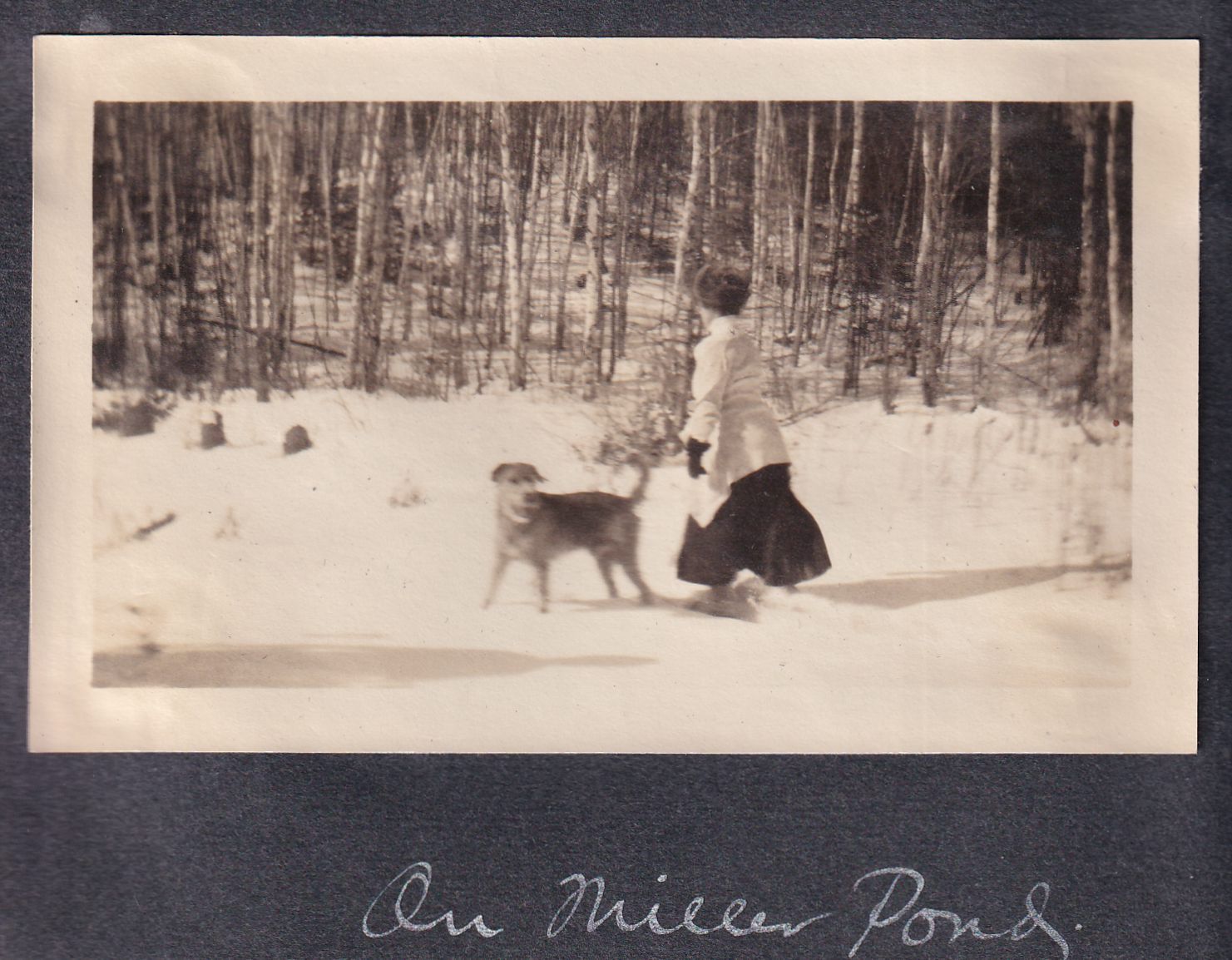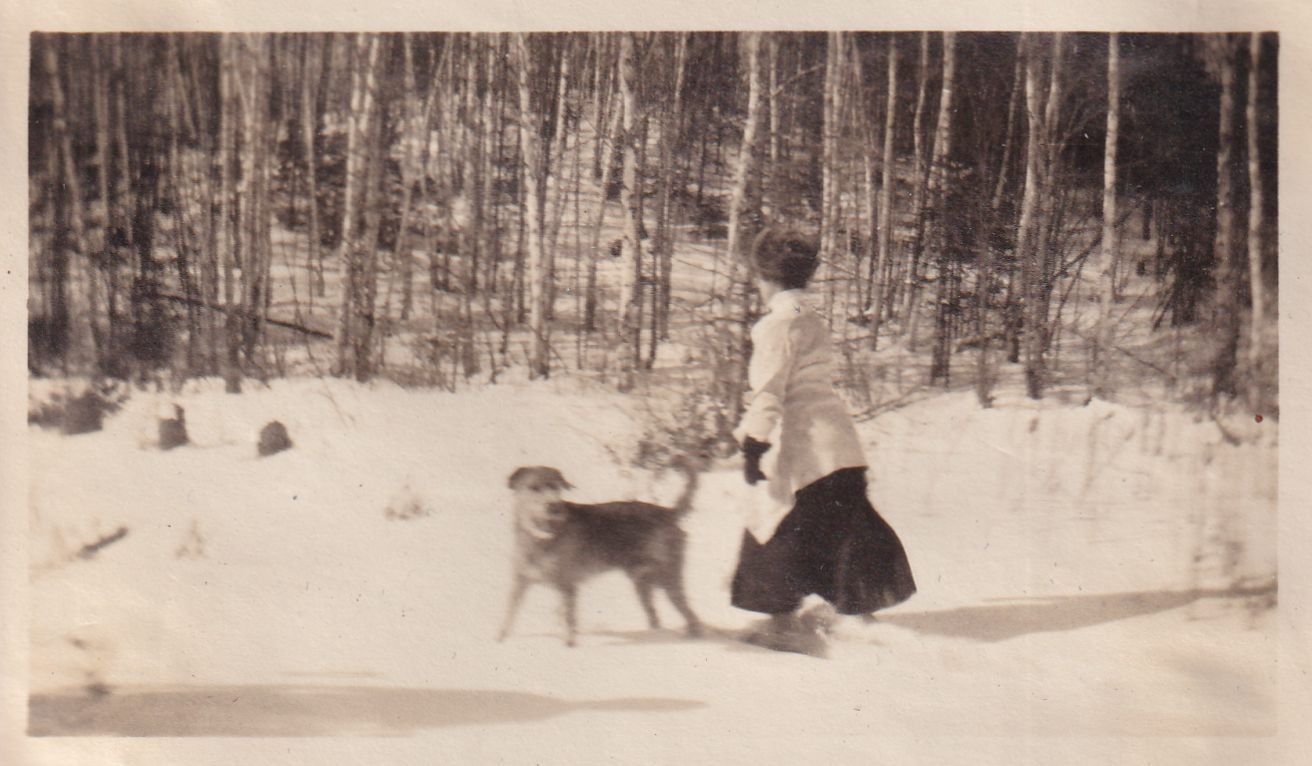 Photograph of a woman, looking away from the camera, with a dog in the snow. Trees are visible behind them.