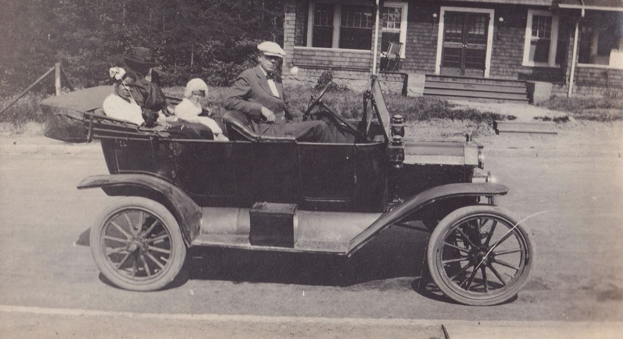 Black-and-white photograph of four people sitting in a car parked in front of a house. There is a Black woman with a bow in her hair sitting in the back seat with a small child and another person whose face is hidden by their hat and jacket.