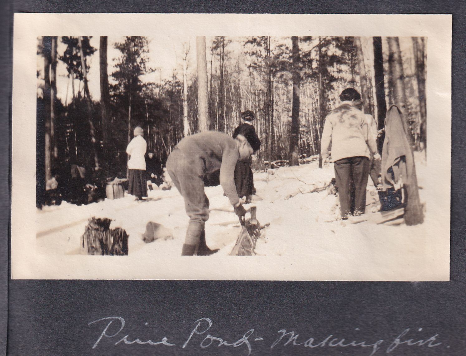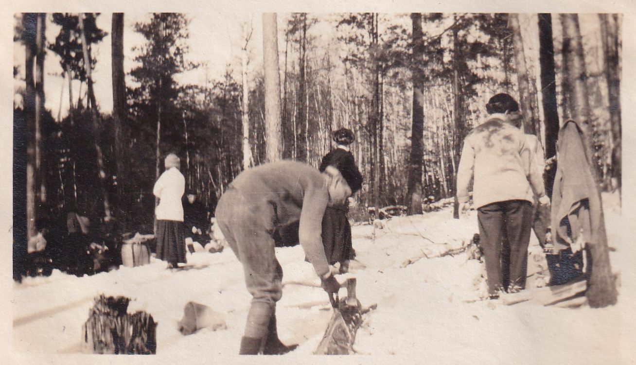 Photograph of a group of people moving around a camp or picnic site. A man in the foreground is holding a hatchet.