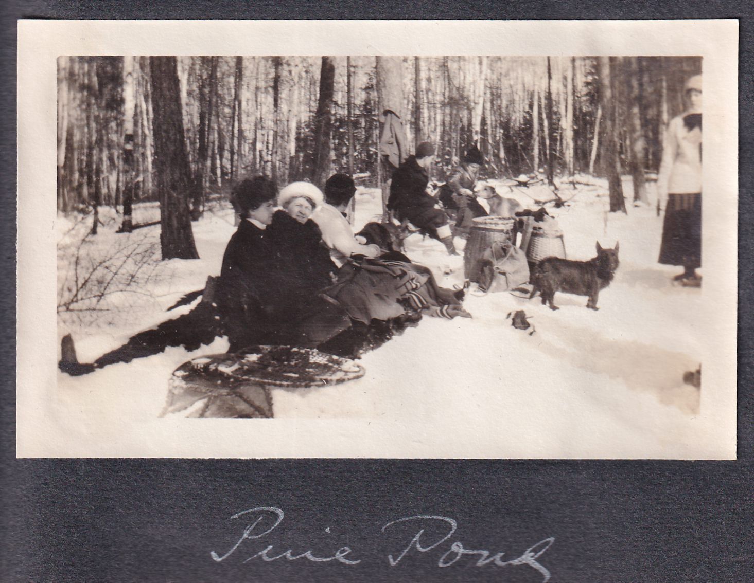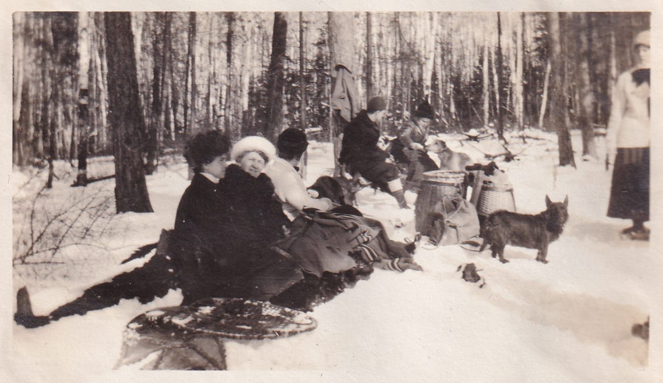 Photograph of a group of people and dogs seated in the snowy woods. They are bundled up in winter clothes and blankets, and are surrounded by snowshoes and packbaskets.