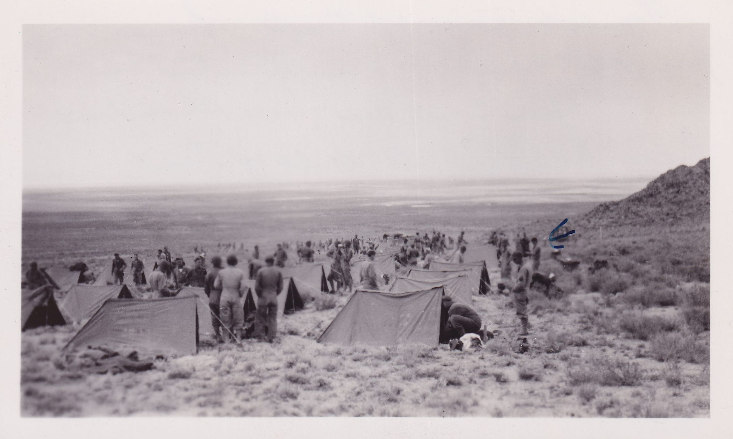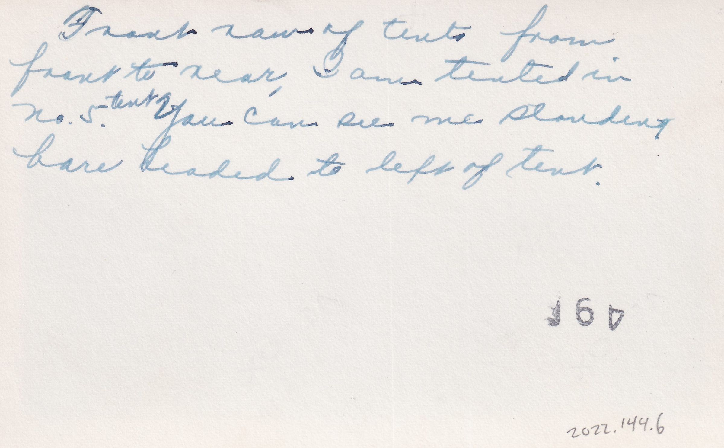 Black-and-White photograph showing a field full of tents and soldiers. A hand-drawn arrow points to one of the soldiers. Handwritten caption on back reads, "Front view of tents from front to rear, I am tented in no. 5 tent. You can see me standing bare headed to left of that."
