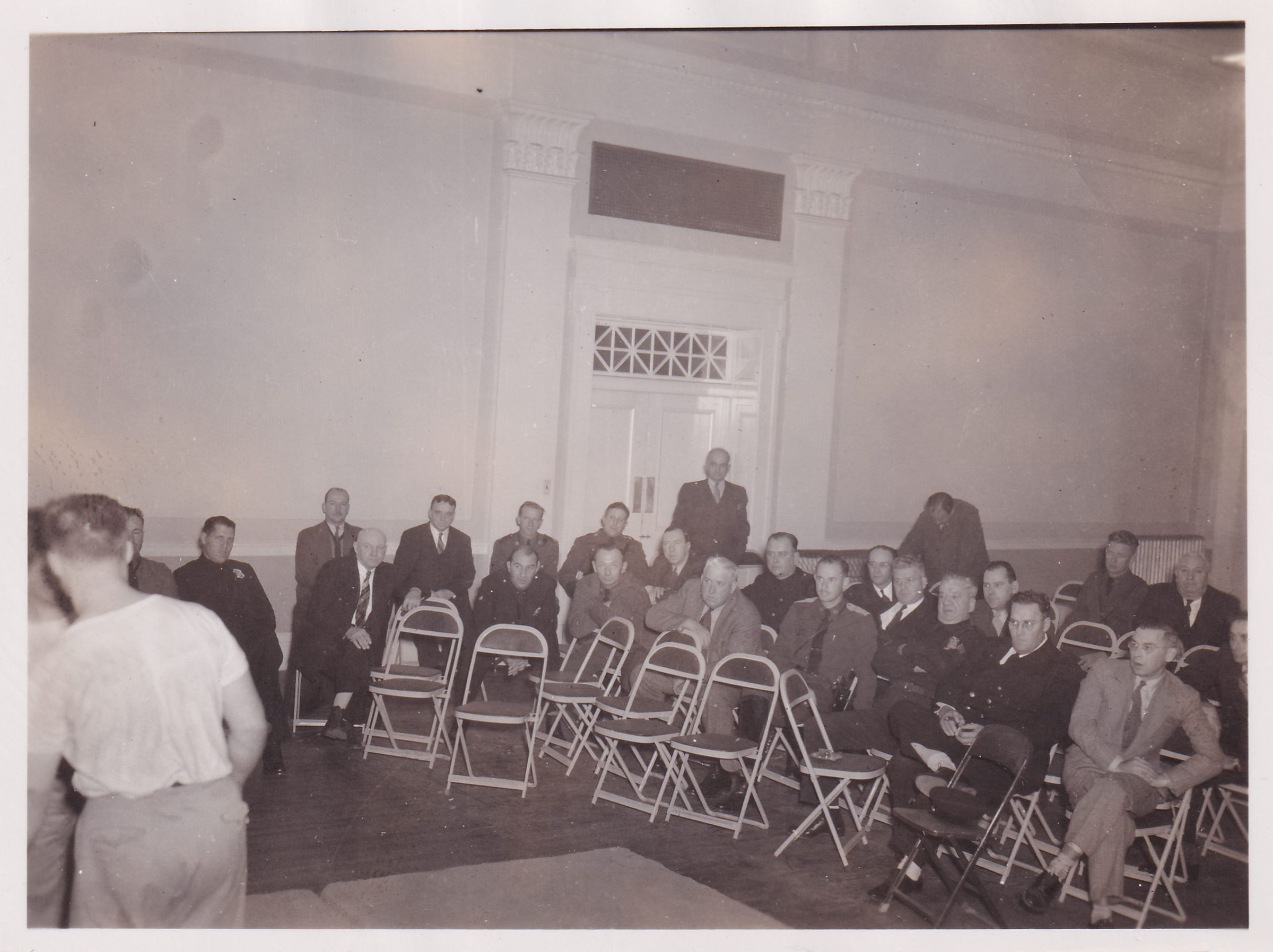 Black-and-White photograph of a group of people seated on folding chairs in a large hall.