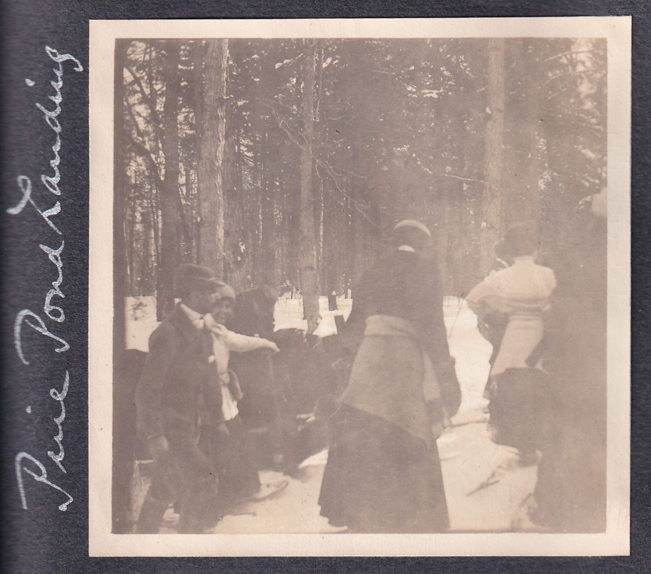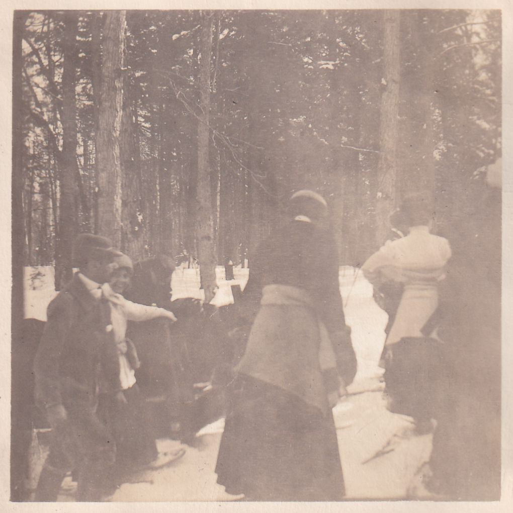 Photograph of a group of people on snowshoes walking in the woods. Some of the people appear to be unloading a sled.