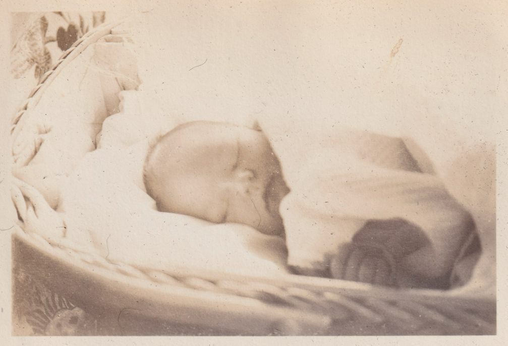 Black-and-White photograph of a newborn Lucy Jones in a wicker cradle. Part of album 2024.21.1, kept by Amy Jones and David Blair Jones c. 1930-1934.