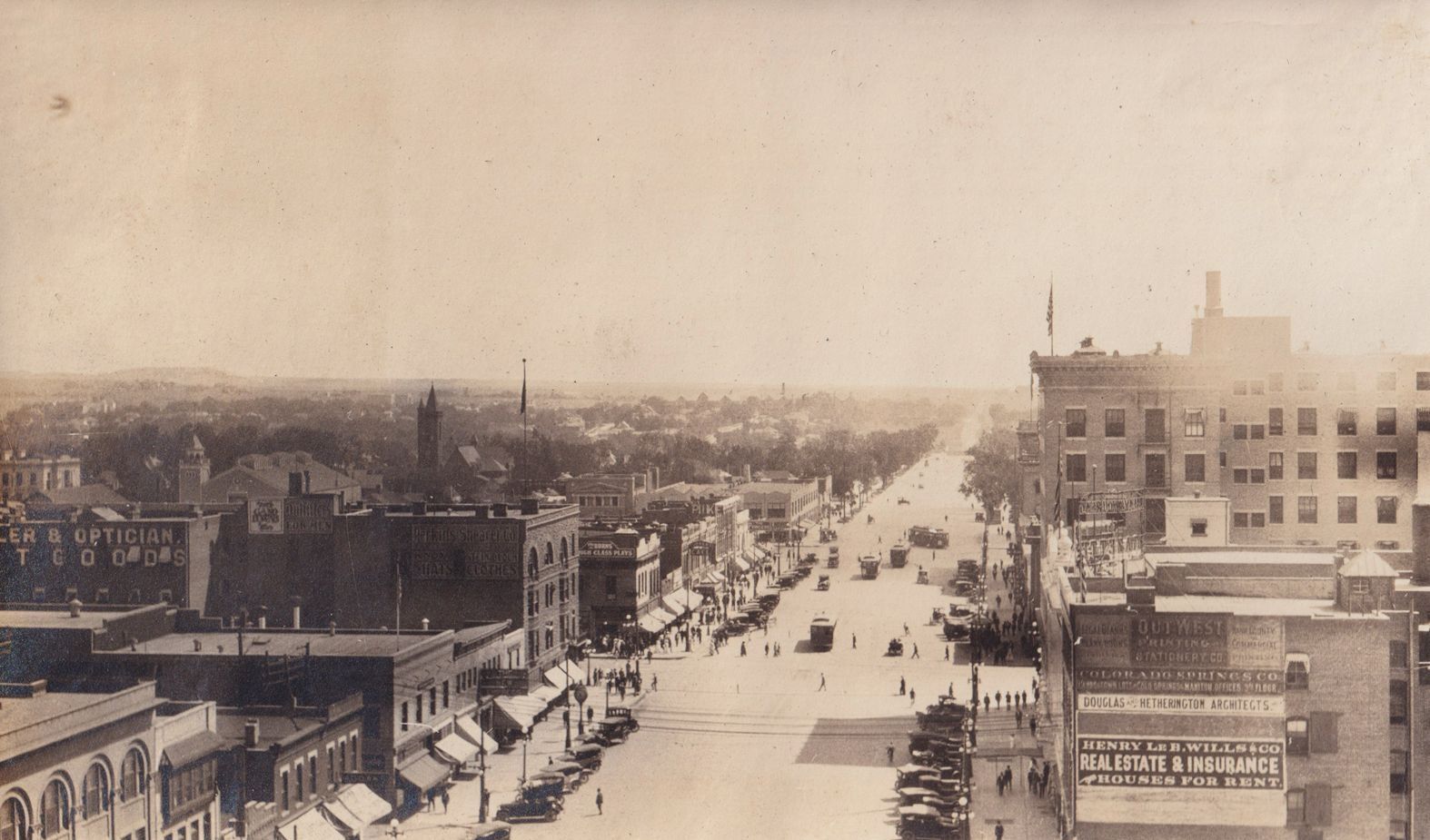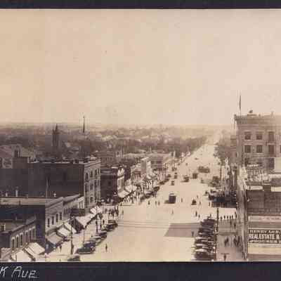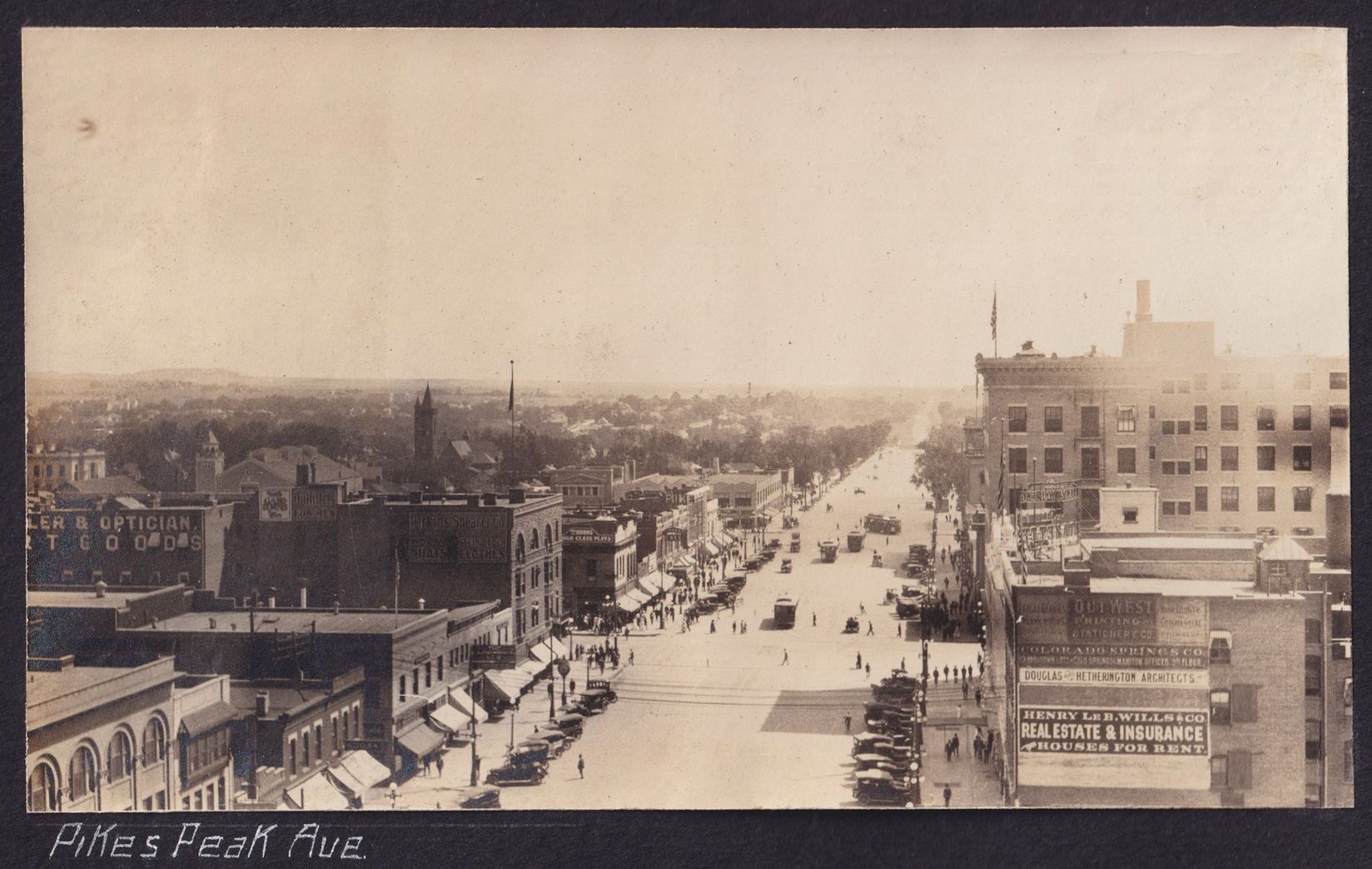 Black-and-white photograph of Pikes Peak Avenue in Colorado Springs, Colorado. The photograph was taken from a high point and looks down on the street, showing the any cars parked along the road and pedestrians walking about. There are many advertisements on the side of the foremost building in the lower right corner of the photo. "Pikes Peak Ave." is written below it the photo in white ink.