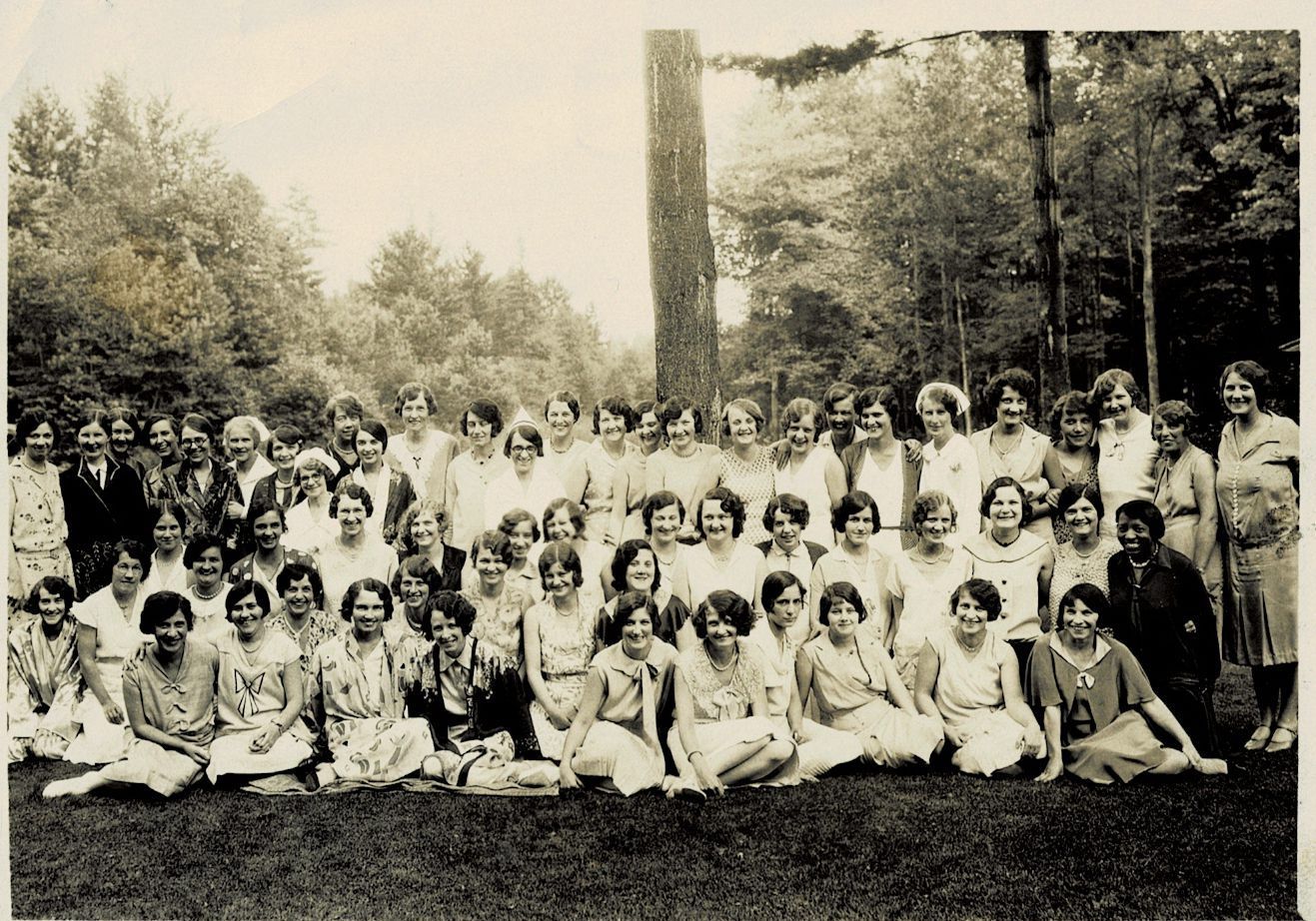Photograph of a group of approximately 47 female patients, nurses, and staff members at the New York State Hospital for Incipient Tuberculosis, AKA Ray Brook Sanatorium, in the late 1920s to early 1930s. The photograph was taken outdoors, likely on the grounds of the sanatorium. Helen Hoeschele Haley is pictured in the back row, fifth from left with glasses and a dressing gown.Photograph Details