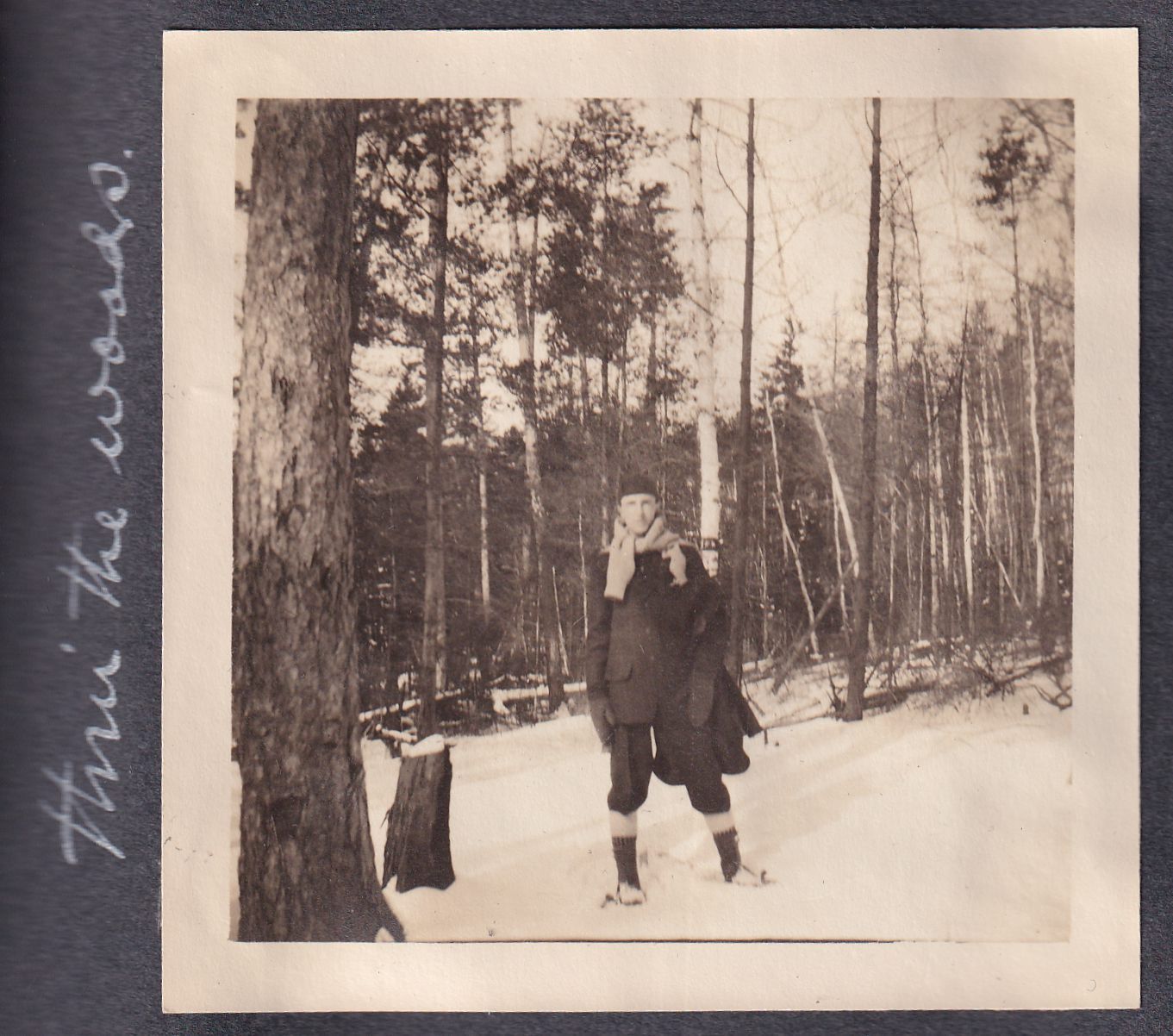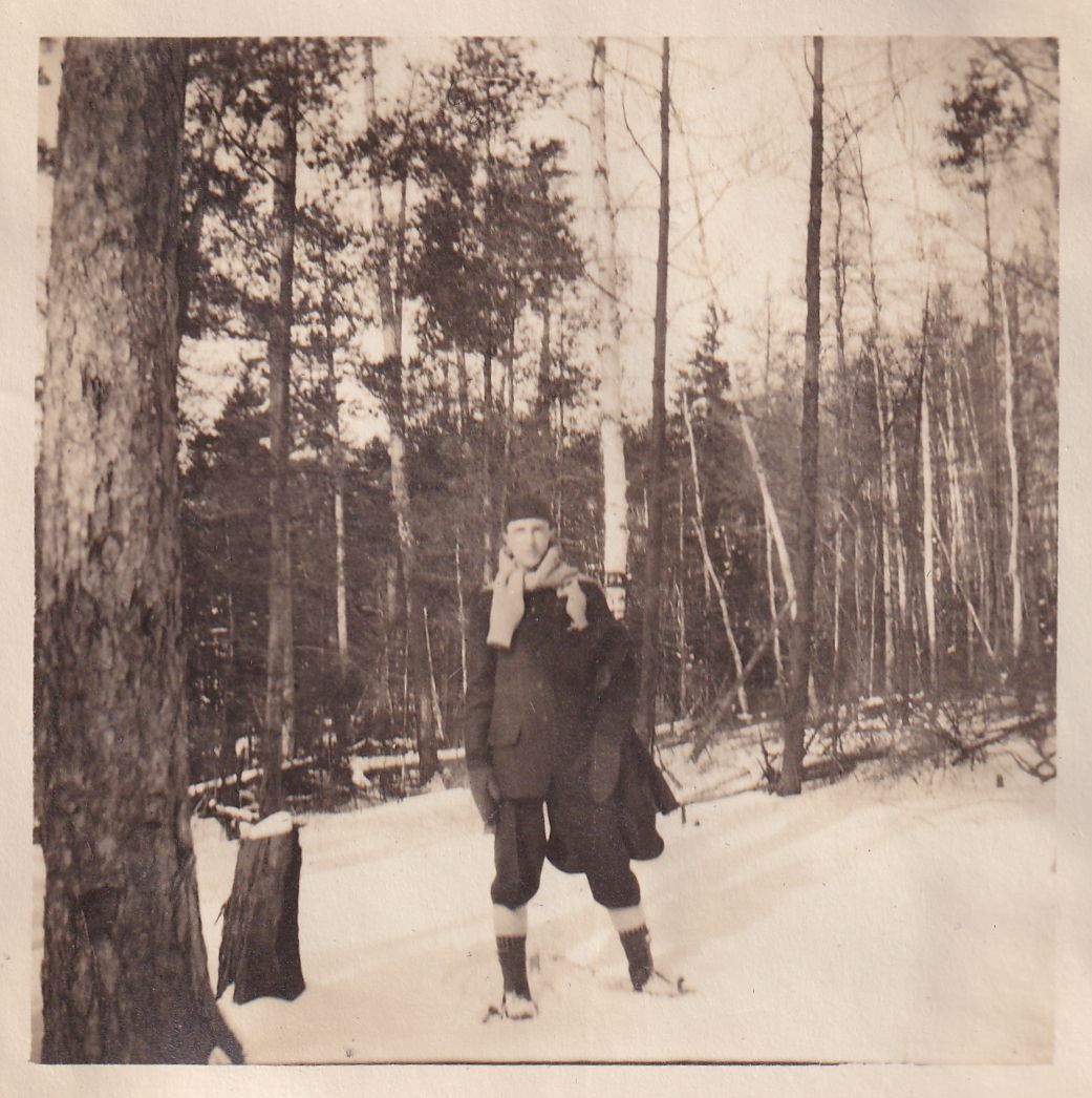 Photograph of an unidentified man, possibly Fletcher Durbin, wearing winter clothing, standing in the snow with trees behind him.