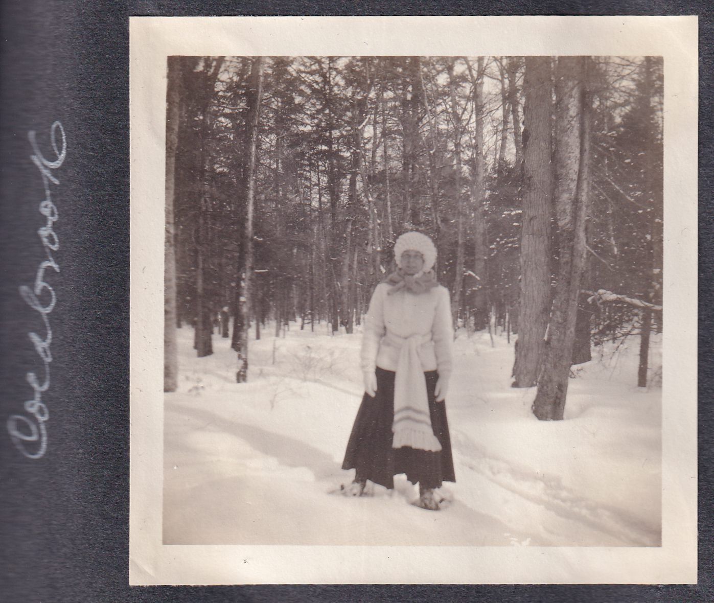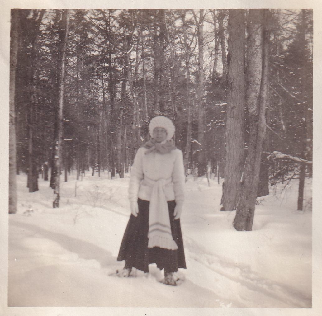 Photograph of a Hazel Durbin wearing snowshoes in the snowy woods. She is dressed in winter clothing.