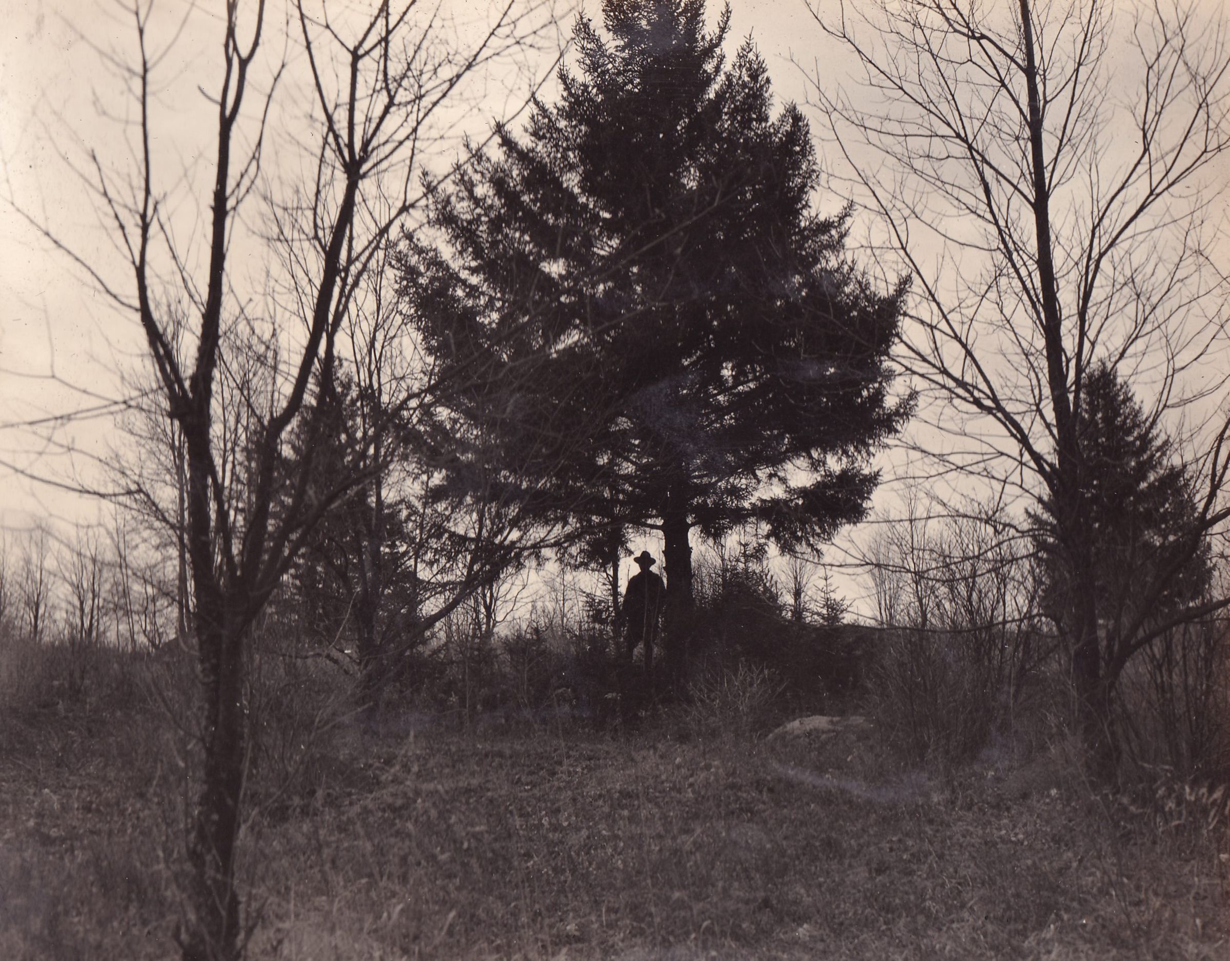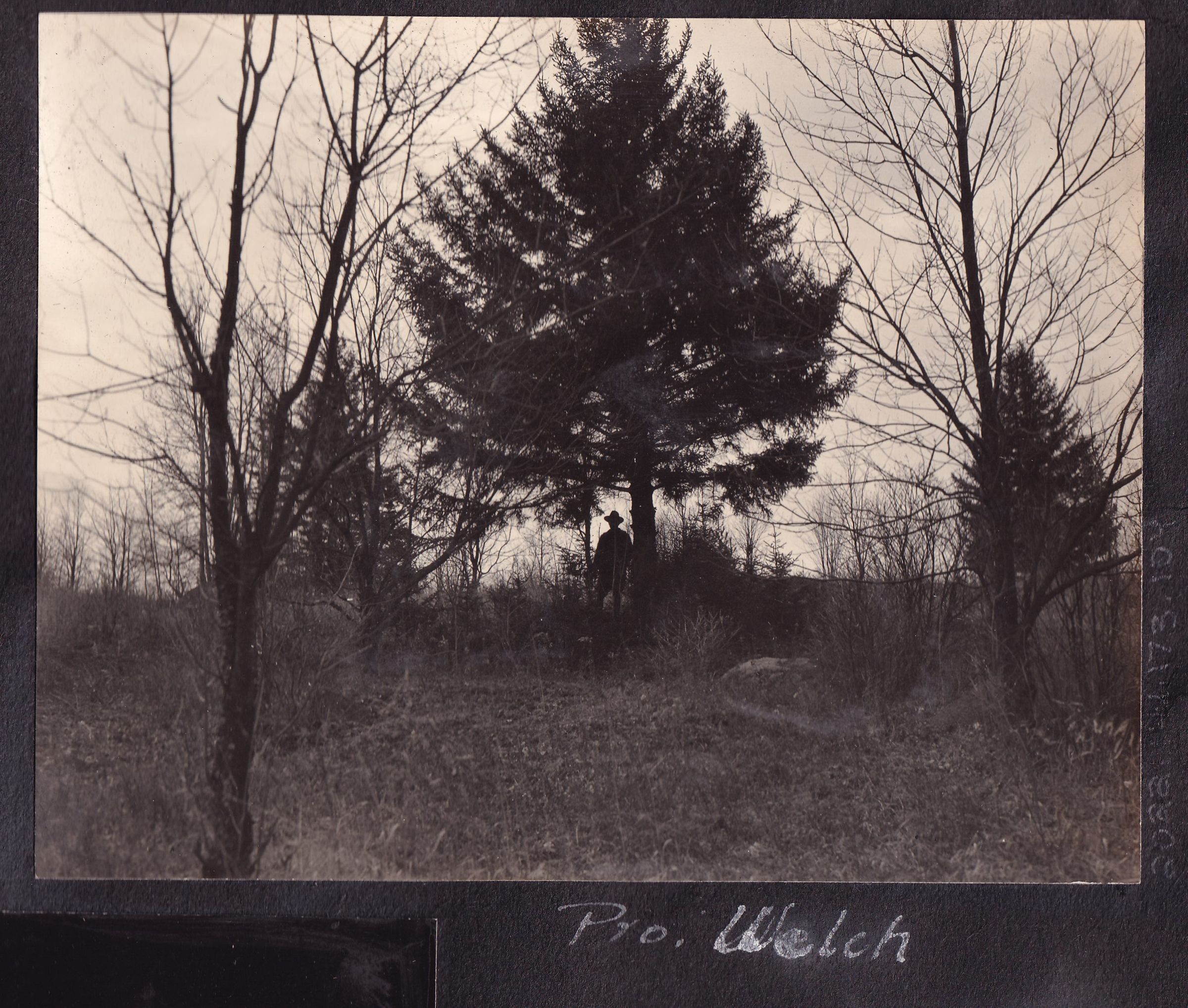 Black-and-White photograph of a man in a game warden uniform standing among trees in the distance. Handwritten caption on page reads, "Pro. Welch."