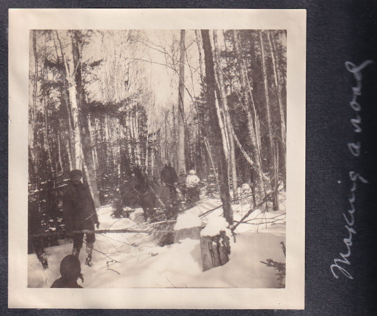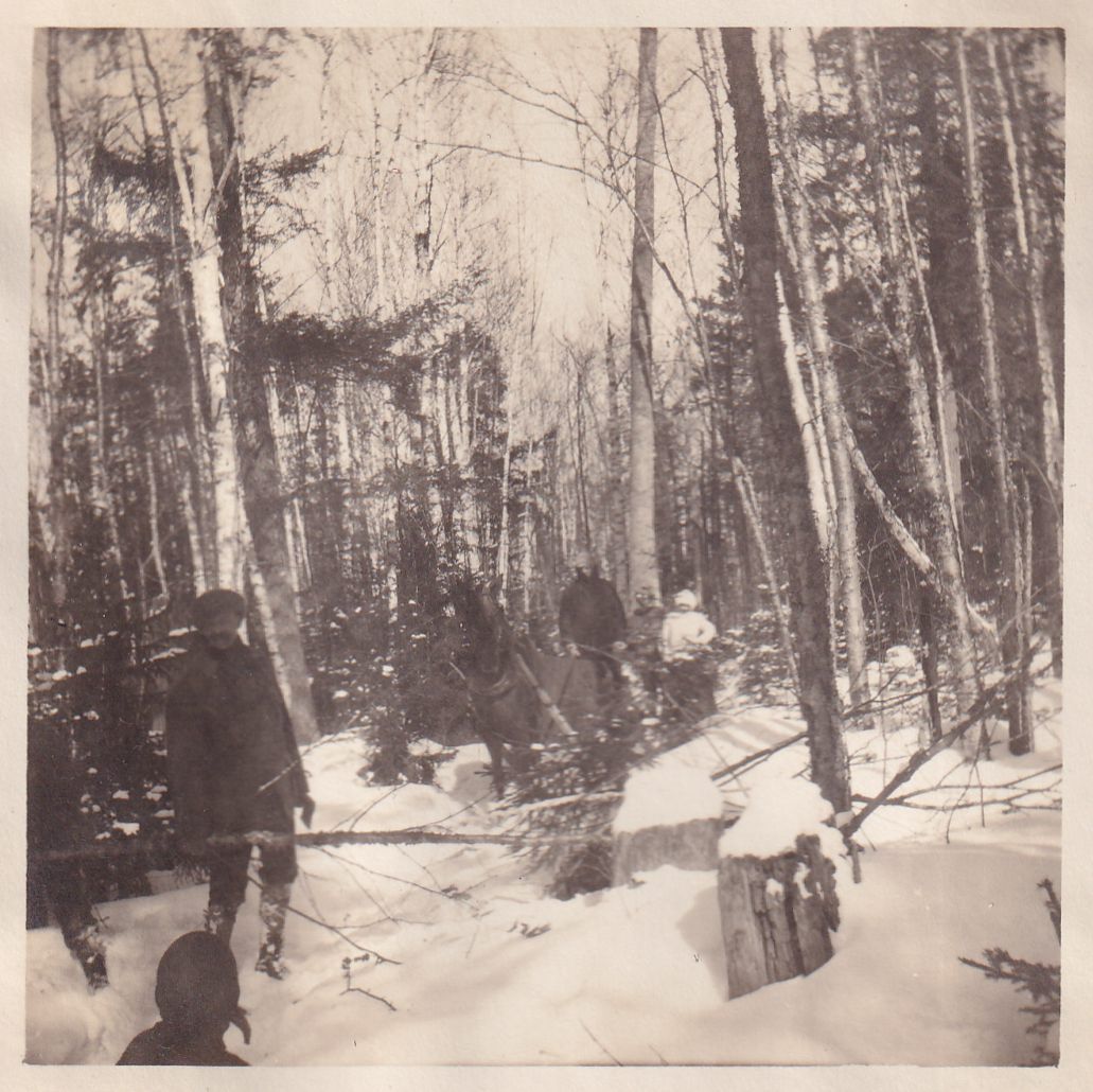 Photograph a group of unidentified people with a horse-drawn sled in the woods. They appear to be clearing a path for the sled by moving small trees.