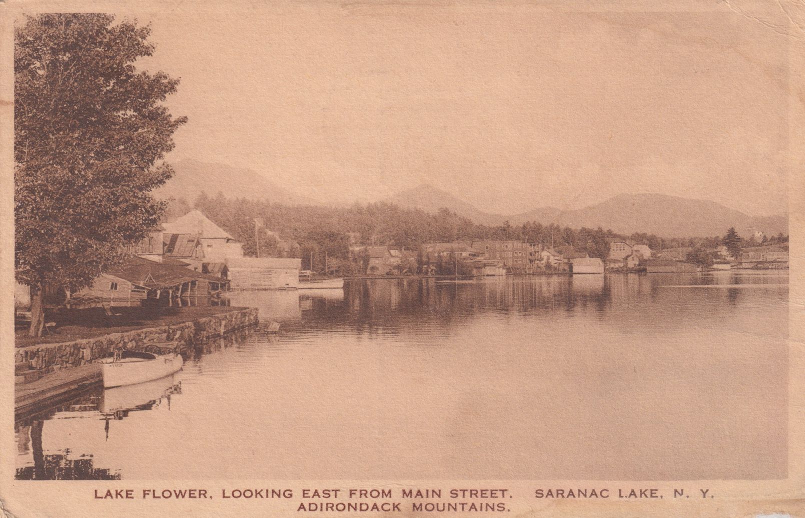 Sepia-toned postcard showing Lake Flower and the buildings along the lake. Printed caption on front reads, "Lake Flower, Looking East from Main Street, Saranac Lake, N. Y., Adirondack Mountains." Published by E. L. Gray & Co., Saranac Lake. Used, divided back, white border, postmarked Saranac Lake, June 8, 1922.