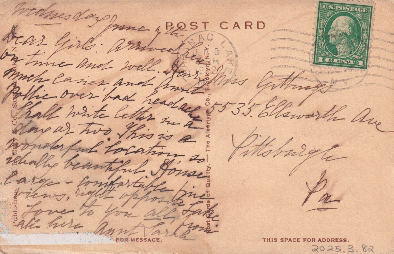 Handwritten message on reverse reads, "Wednesday June 7th. Dear Girls, Arrived here on time and well. Henry much easier, and Aunt Pollie over bad headache. Shall write letters in a day or two. This is a wonderful location, so ideally beautiful. House large -- comfortable, fine views. Right opposite Lake. Love to you all [underlined] from. all here. Aunt Sarah." Mailed to Miss Githings. 5535 Ellsworth Ave. Pittsburgh. Pa.Subject Place