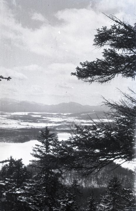 Negative of a snow and ice covered landscape, taken from high among behind pine trees. Taken by Mary Ives Baldwin. This item is not fully cataloged but has been uploaded so the image is publicly available; if you would like us to prioritize cataloging this item, please contact the HSL Collections team.