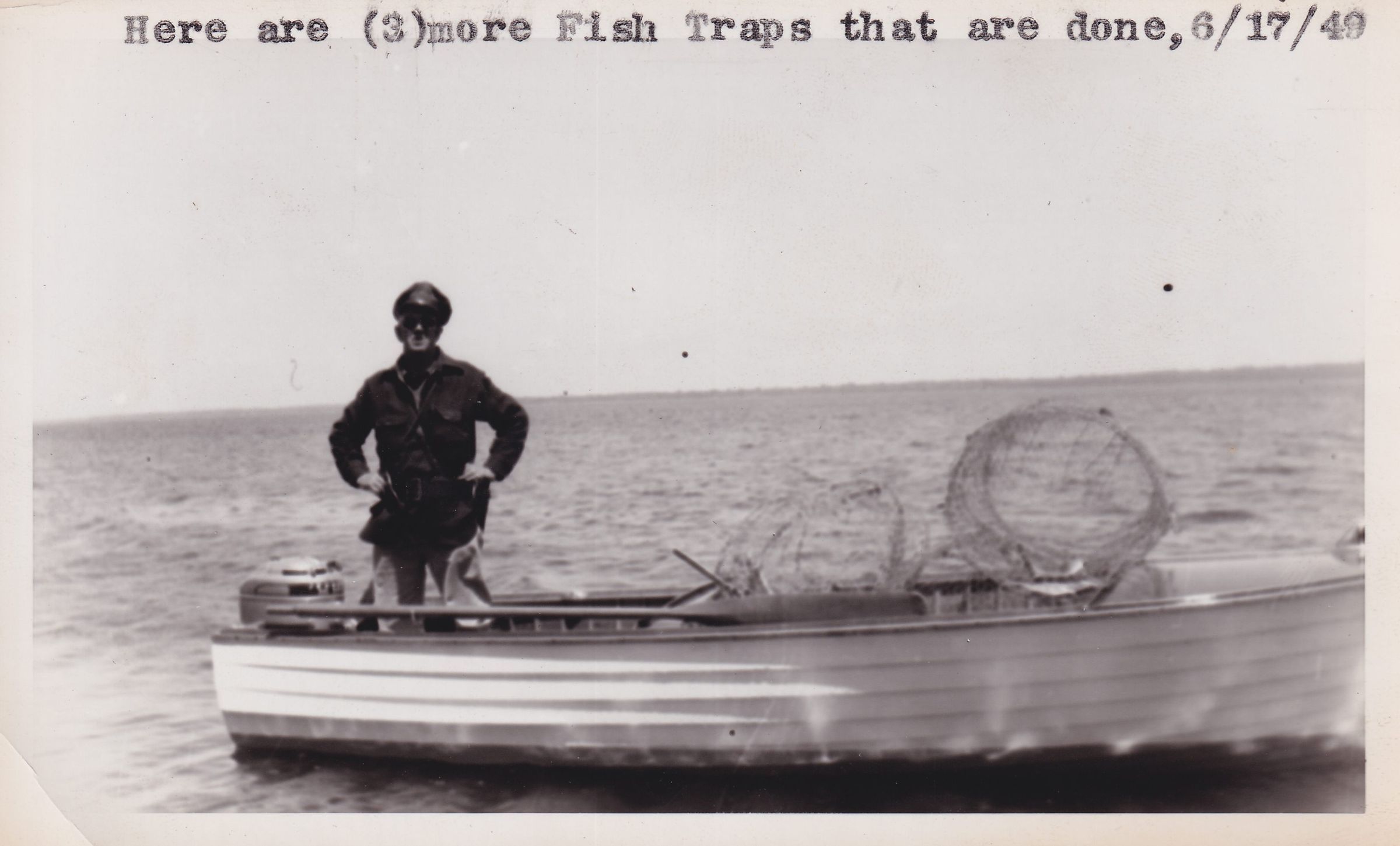 Black-and-White photograph of a man in a game warden uniform standing on a boat, surrounded by fishing nets. Handwritten caption on front reads, "Here are (3) more fish traps that are done, 6/17/49." Print has decorative scalloped border.
