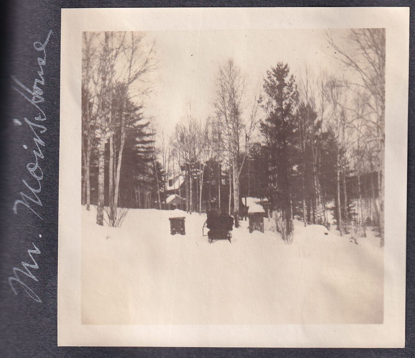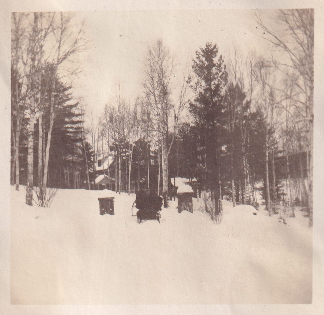 Photograph of a receding sleigh as it passes between two stone or brick gateposts. A portion of a house is visible through the woods in front of the sleigh. This is likely the Moir Camp on Lake Colby.