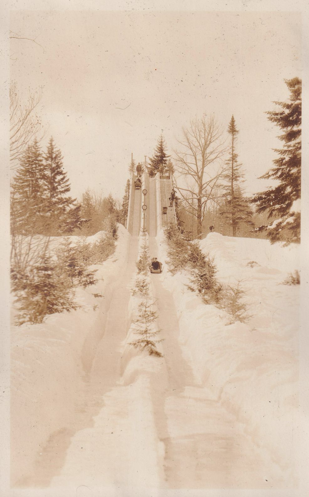 Black-and-White photograph of a toboggan run in an unidentified location. Riders can be seen on toboggans.