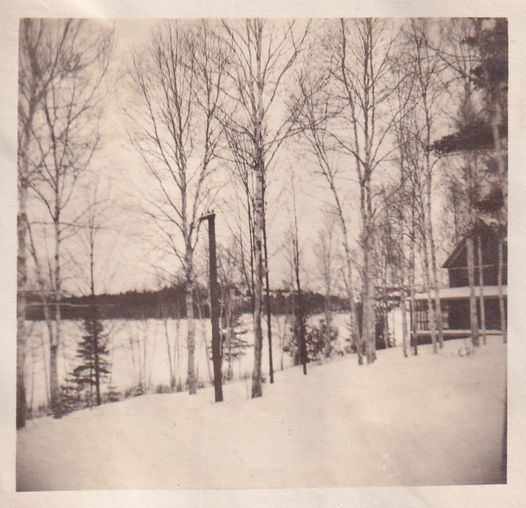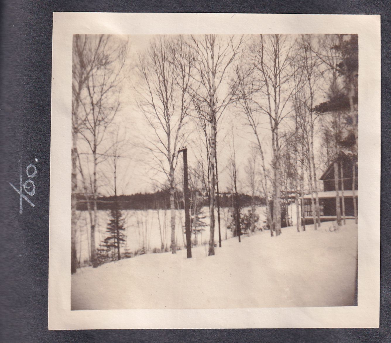Photograph of trees and a portion of a house along the shore of Lake Colby. This is likely part of the Moir Camp.