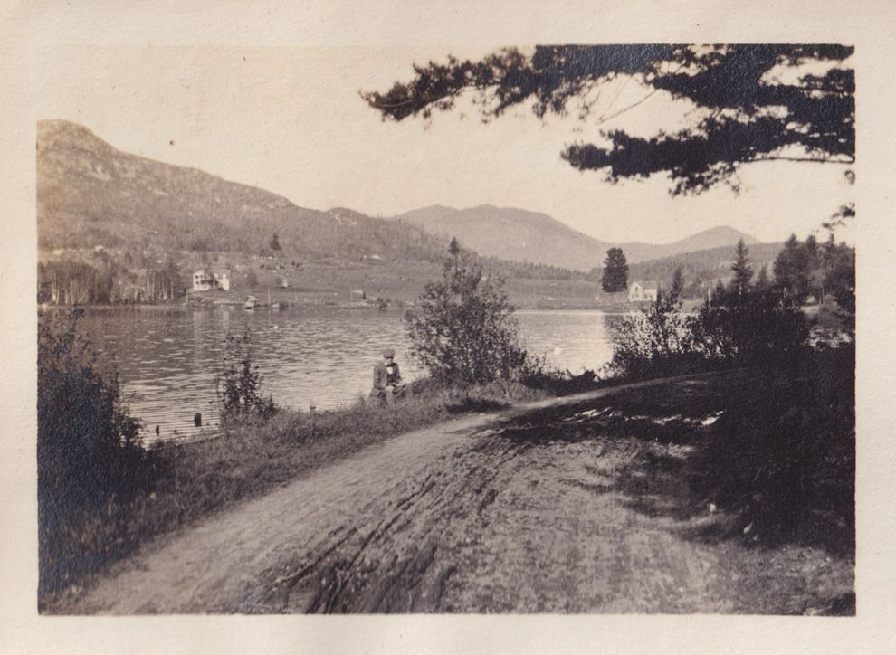 Black-and-white photograph of the bend in a road as it follows the shoreline of a lake. The lake is visible after the road, and there are two houses on the other side of the lake as well as some mountains or taller hills.