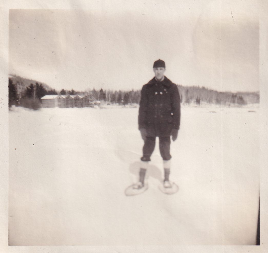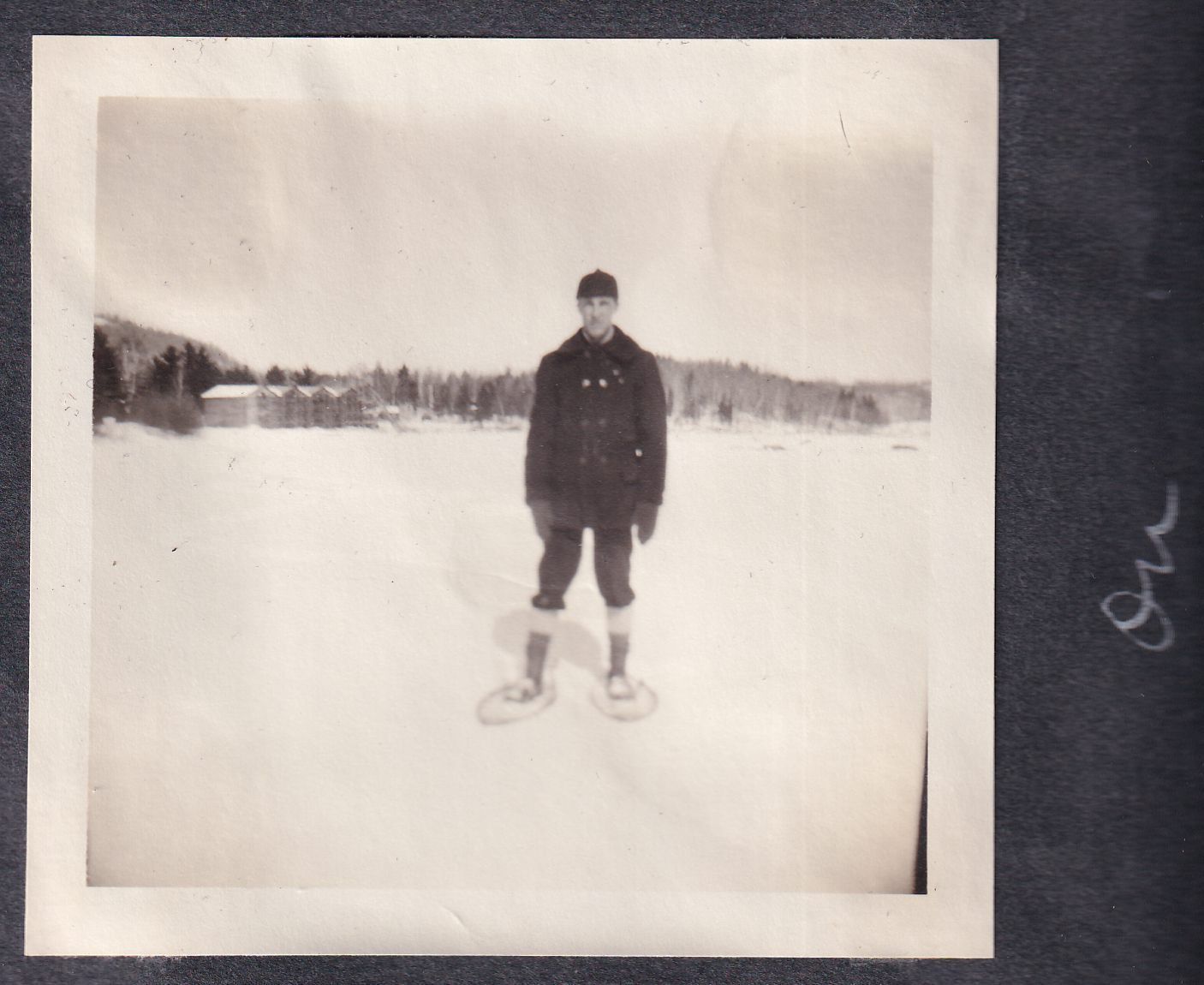 Photograph of Fletcher Durbin wearing snowshoes standing on a frozen Moody Pond.