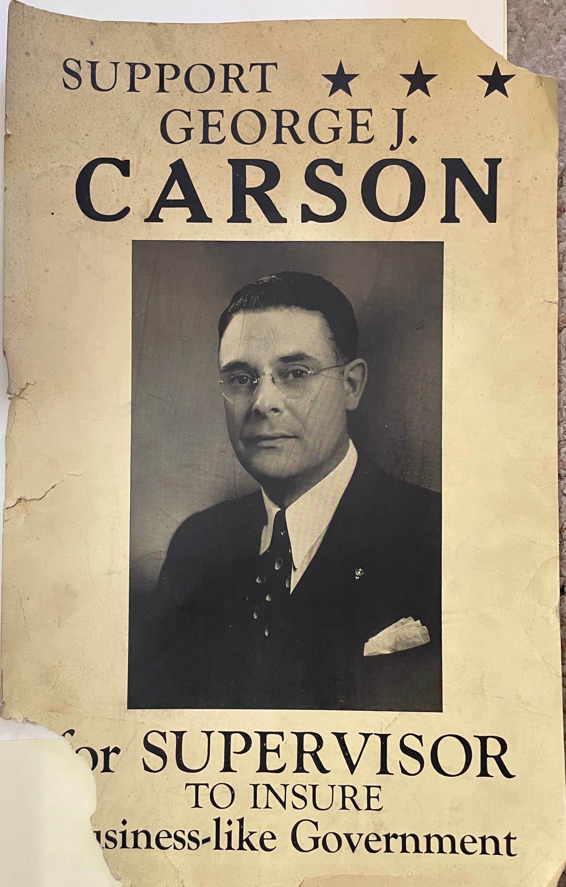 Poster for George J. Carson’s supervisor [possibly mayor] bid, c. 1940. Reads, “Support George J. Carson, for Supervisor to Insure Business-Like Government,” with headshot of Carson and three stars. Printed in black and white.