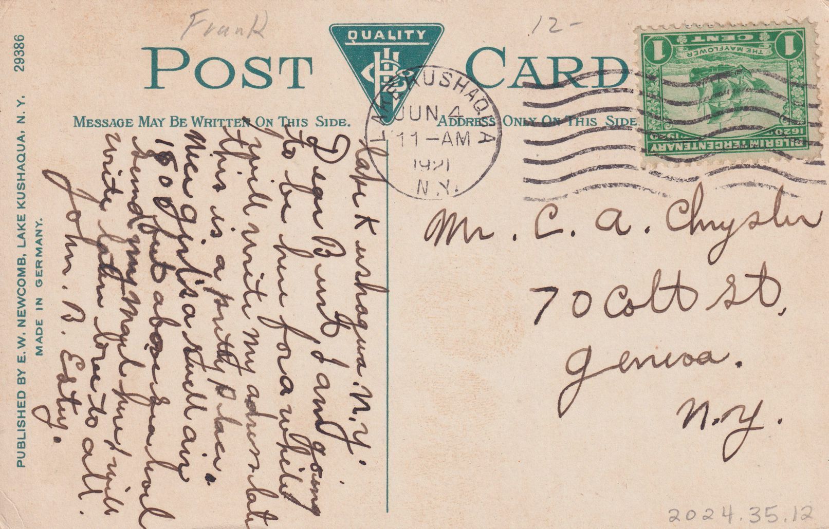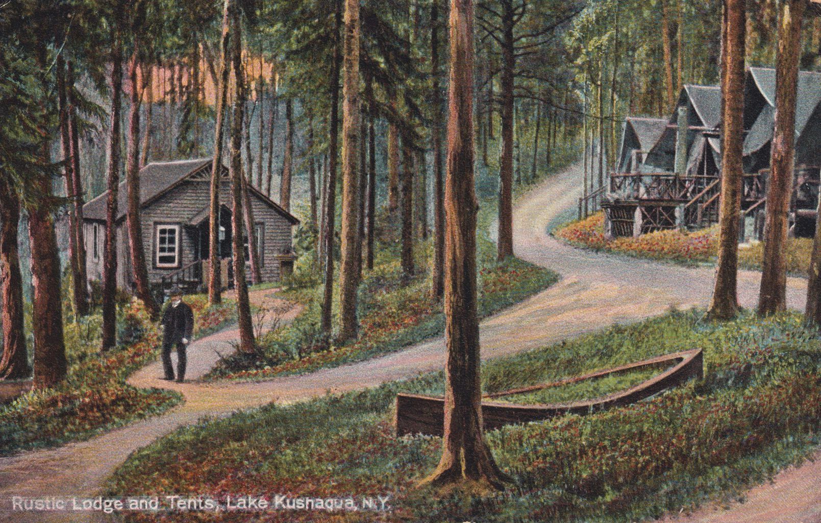 Color postcard showing platform tents in the woods with paths leading between them. A man can be seen standing on the path and a guideboat is sitting in the grass. Printed caption on front reads, "Rustic Lodge and Tents, Lake Kushaqua, N.Y." Printed by E. W. Newcomb, Lake Kushaqua, NY. Used, divided back, postmarked Lake Kushaqua, NY, June 4, 1921. Handwritten message on reverse reads, "Lake Kushaqua, N.Y. Dear Burt, I am going to be here for a while. I will write my address later. This is a pretty place. Nice girl's a swell air 1500 feet above sea level. Send my mail to me I will write later. Love to all. John B. Estey." Mailed to Mr. C. A. Chrysler, 70 Colt St., Geneseo, NY.Subject Place