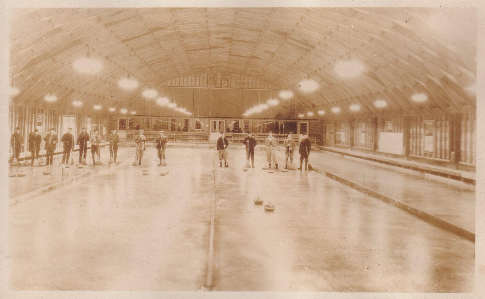 Black-and-White photograph of the interior of the Saranac Lake Curling Club. A line of curlers are standing on the ice with brooms and curling stones.