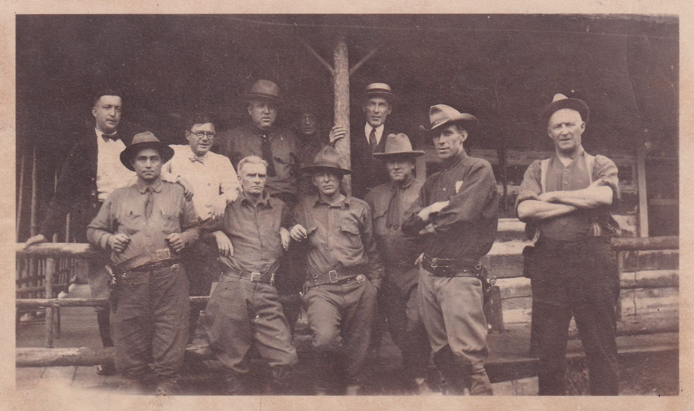 Black-and-White photograph of a group of men standing on and around the porch of a cabin. Many of the men are wearing game warden uniforms. Ray Burmaster is standing on the porch to the left of the pole, in uniform. This is the same photograph as 2022.144.26.