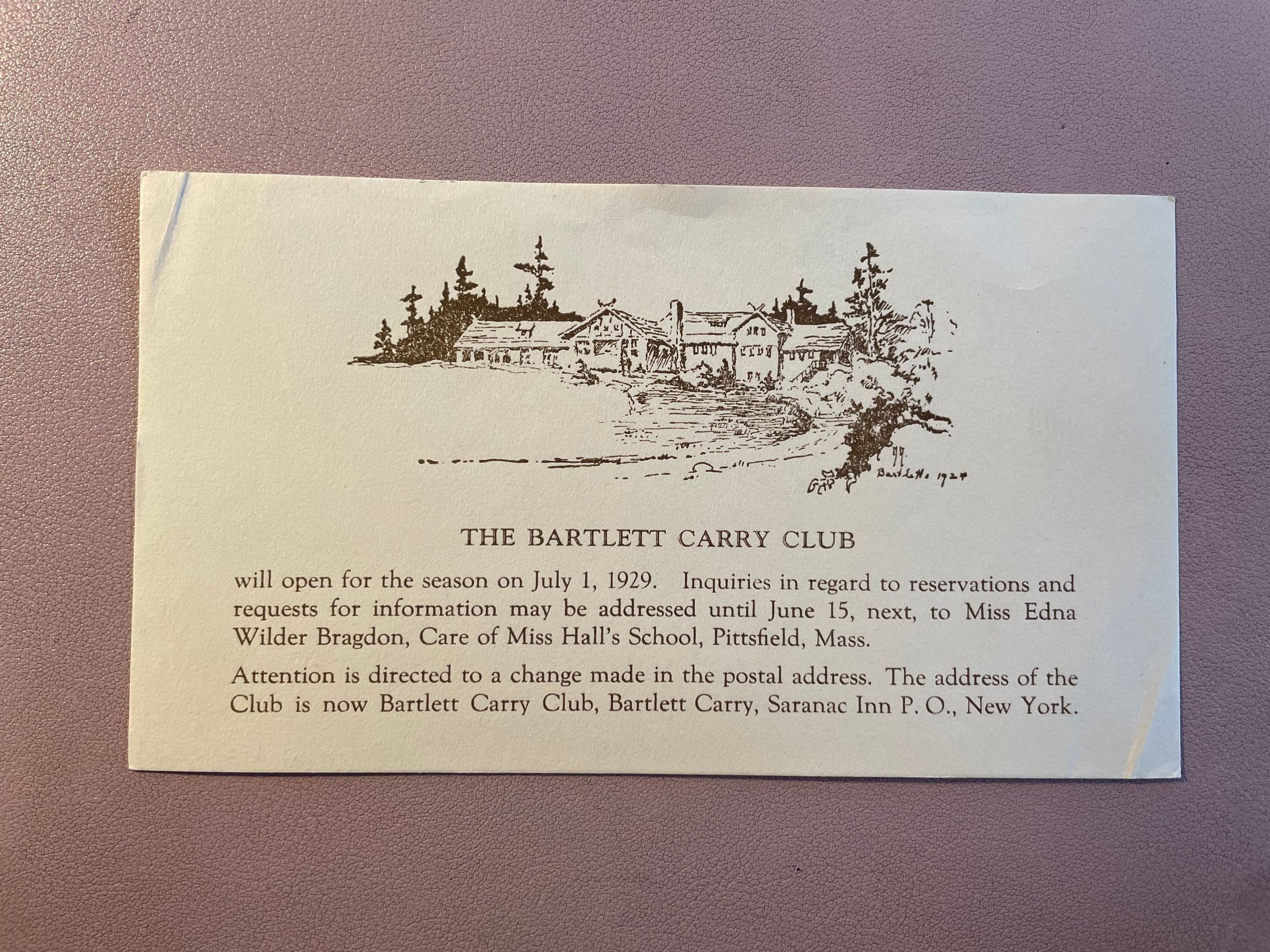 Card advertising the Bartlett Carry Club 1929 season.