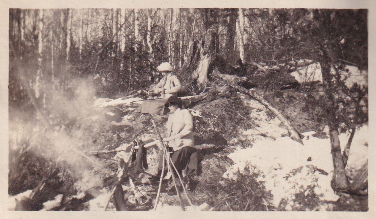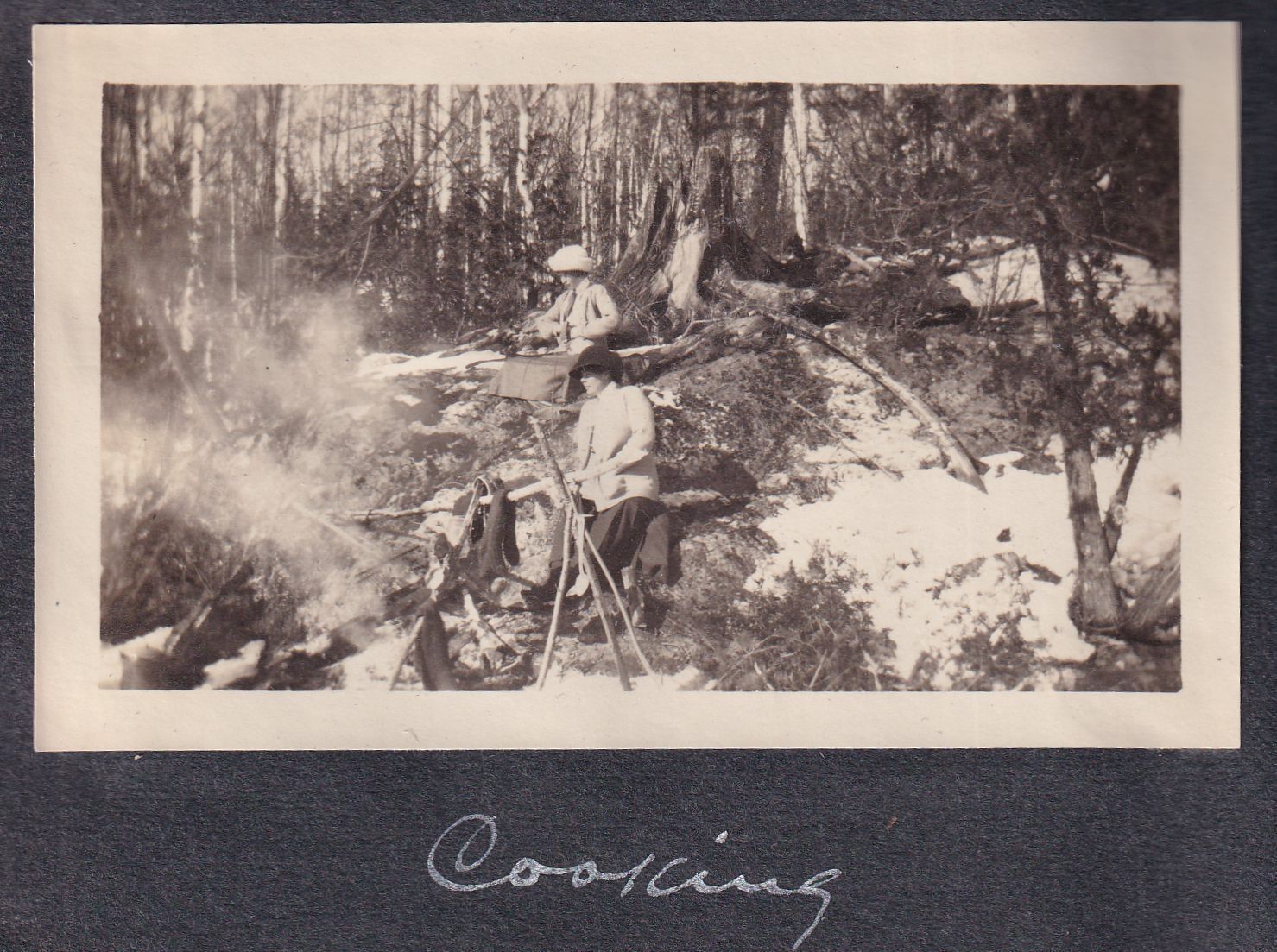 Photograph of two unidentified women seated on a boulder. There is a cookfire with a pot hanger fashioned out of sticks over it on the ground in front of them.