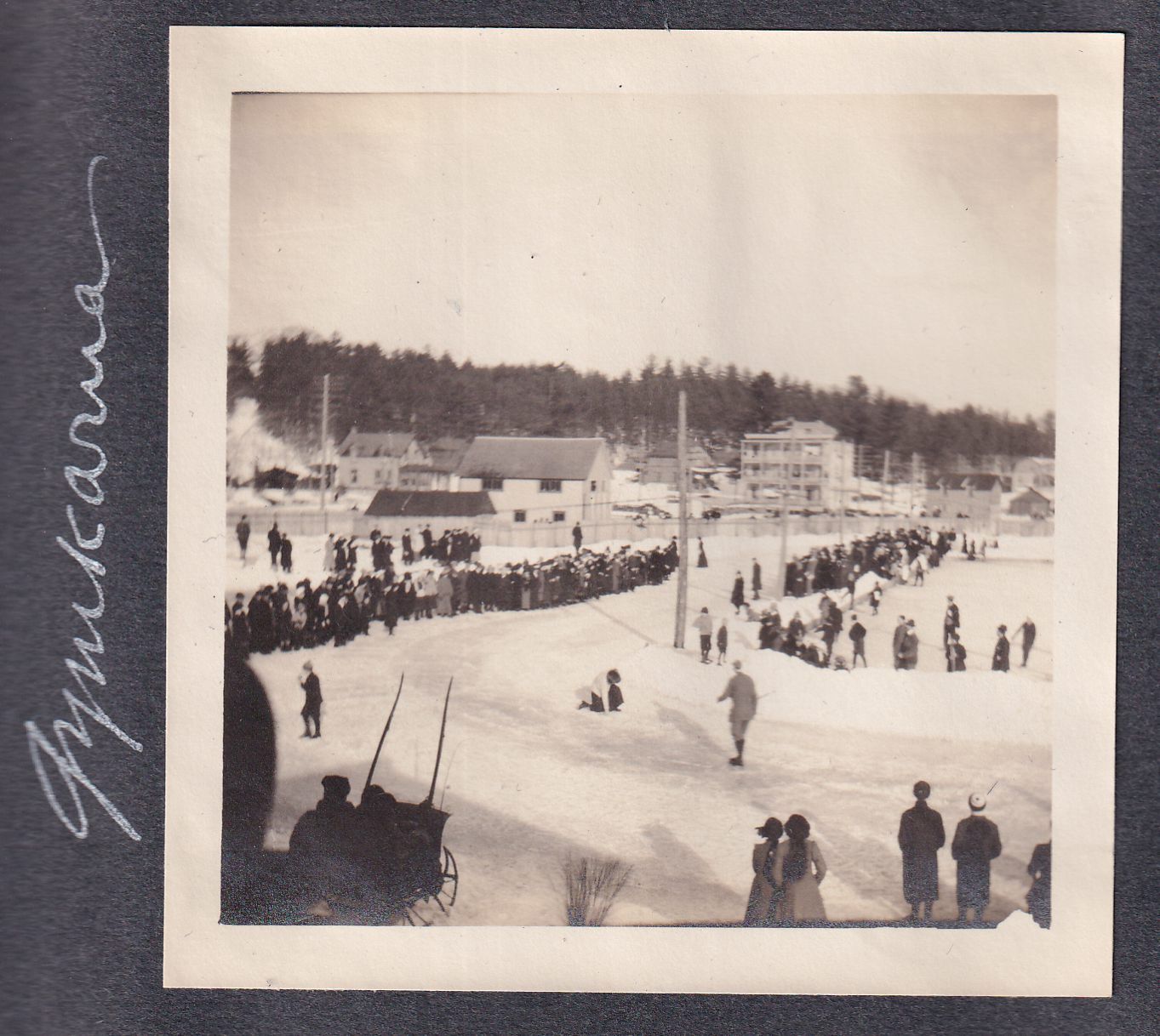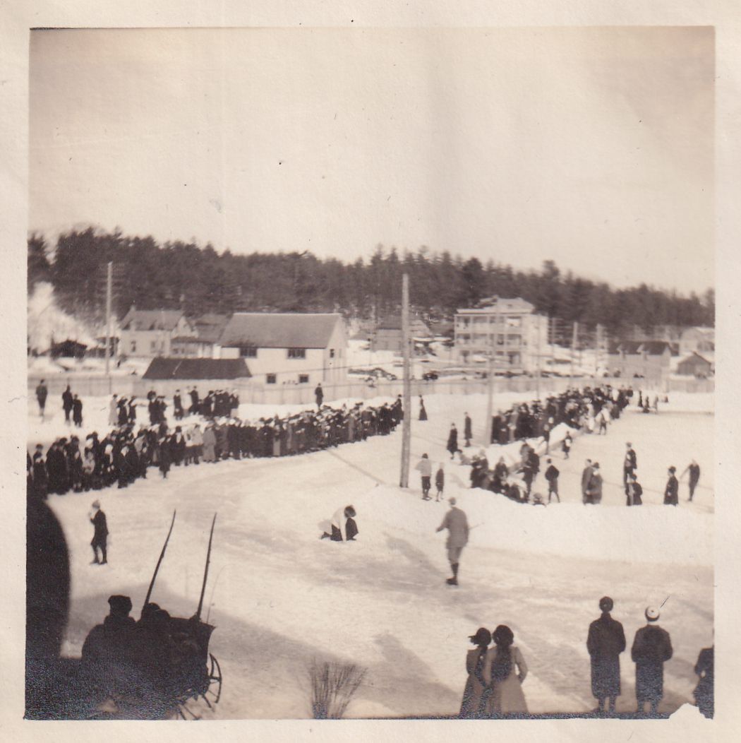 Photograph of skaters and bystanders around the skating track at Pontiac Bay. [The only "Gymhkana" we have record of took place instead of Winter Carnival in 1914. It is possible this photograph is from that event, or it was held on more than one year.]