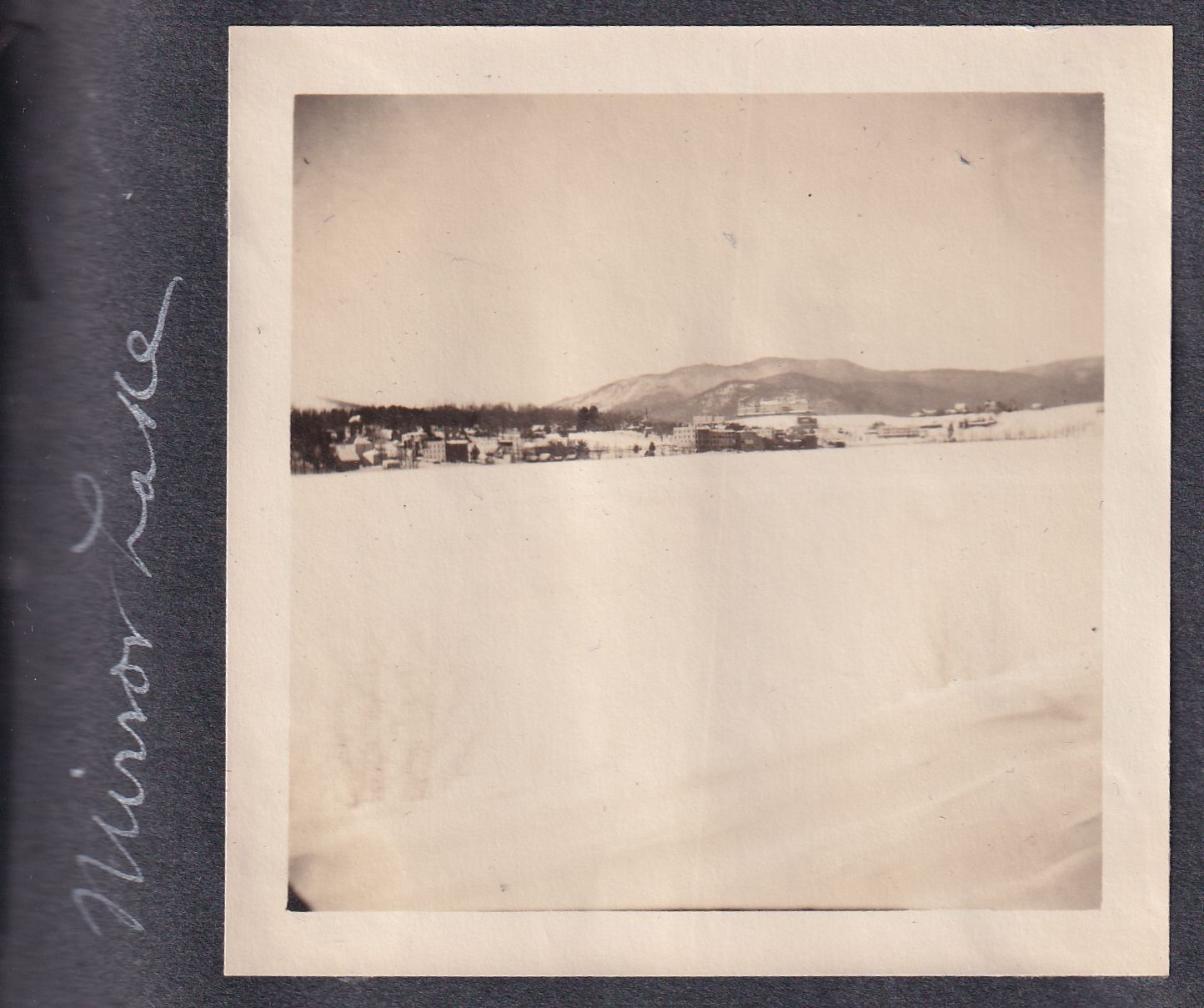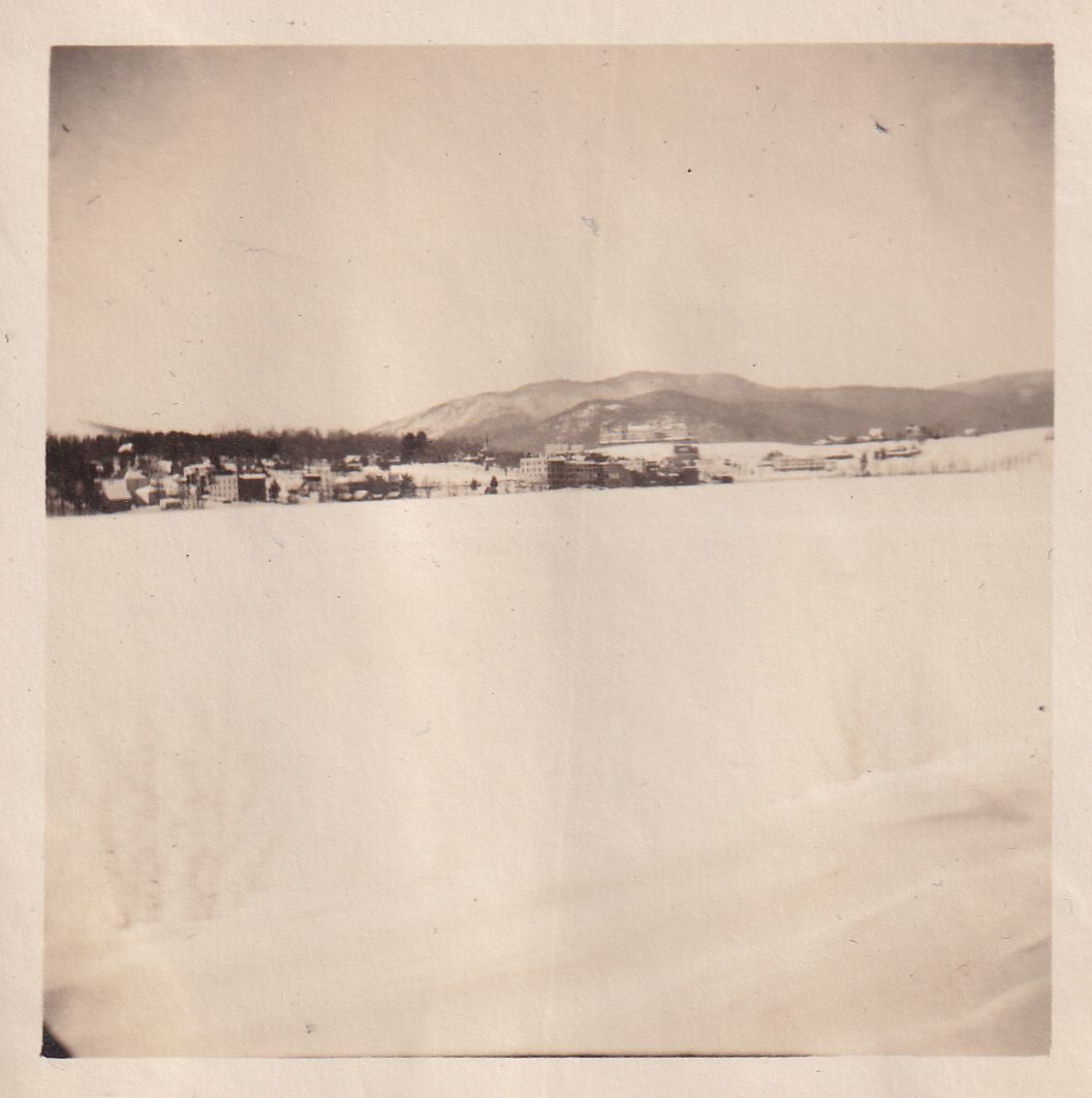 Photograph taken from a distance, looking across Mirror Lake with downtown Lake Placid visible on the other side of the lake.