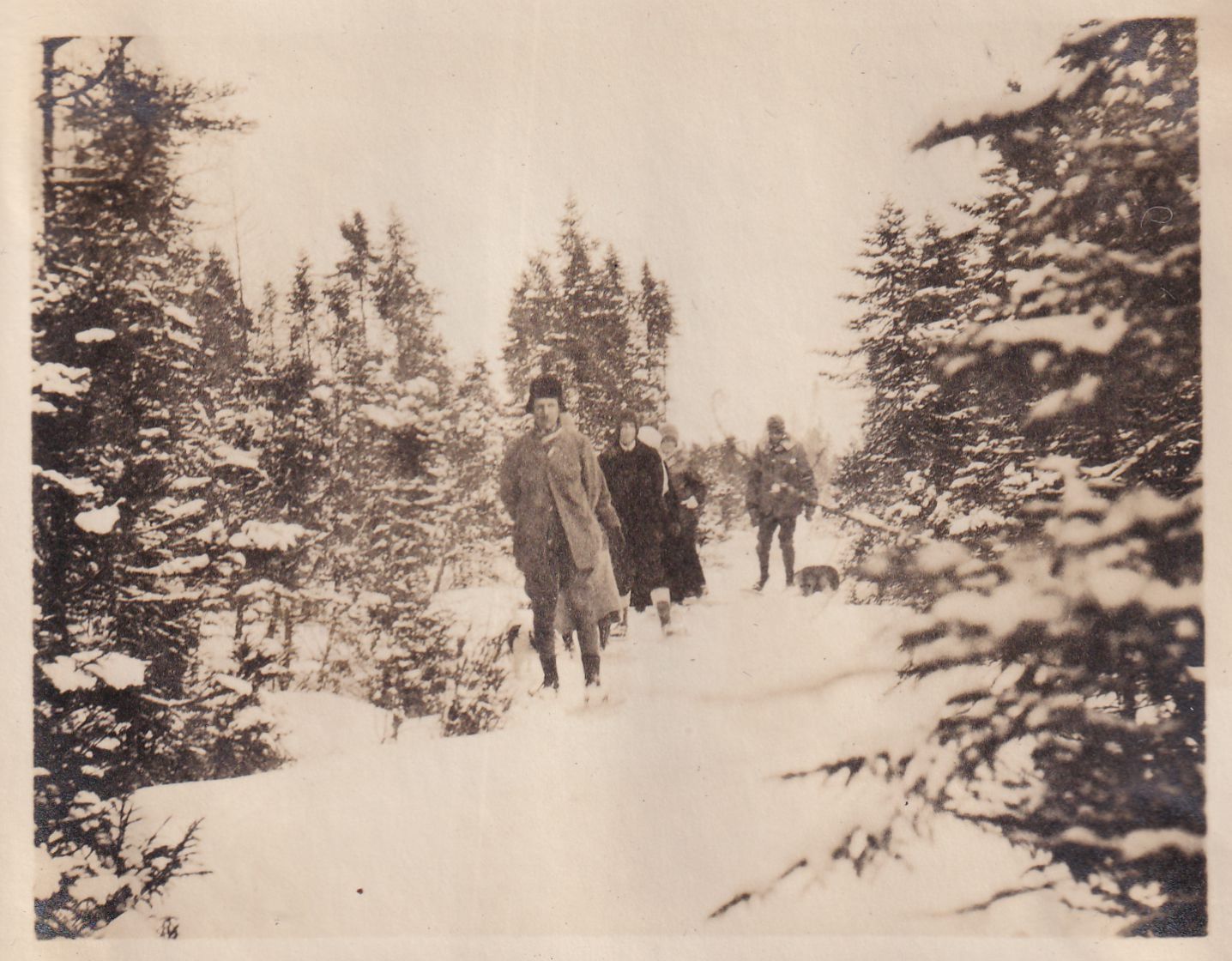 Photograph of a group of unidentified people snowshoeing on a wooded trail.