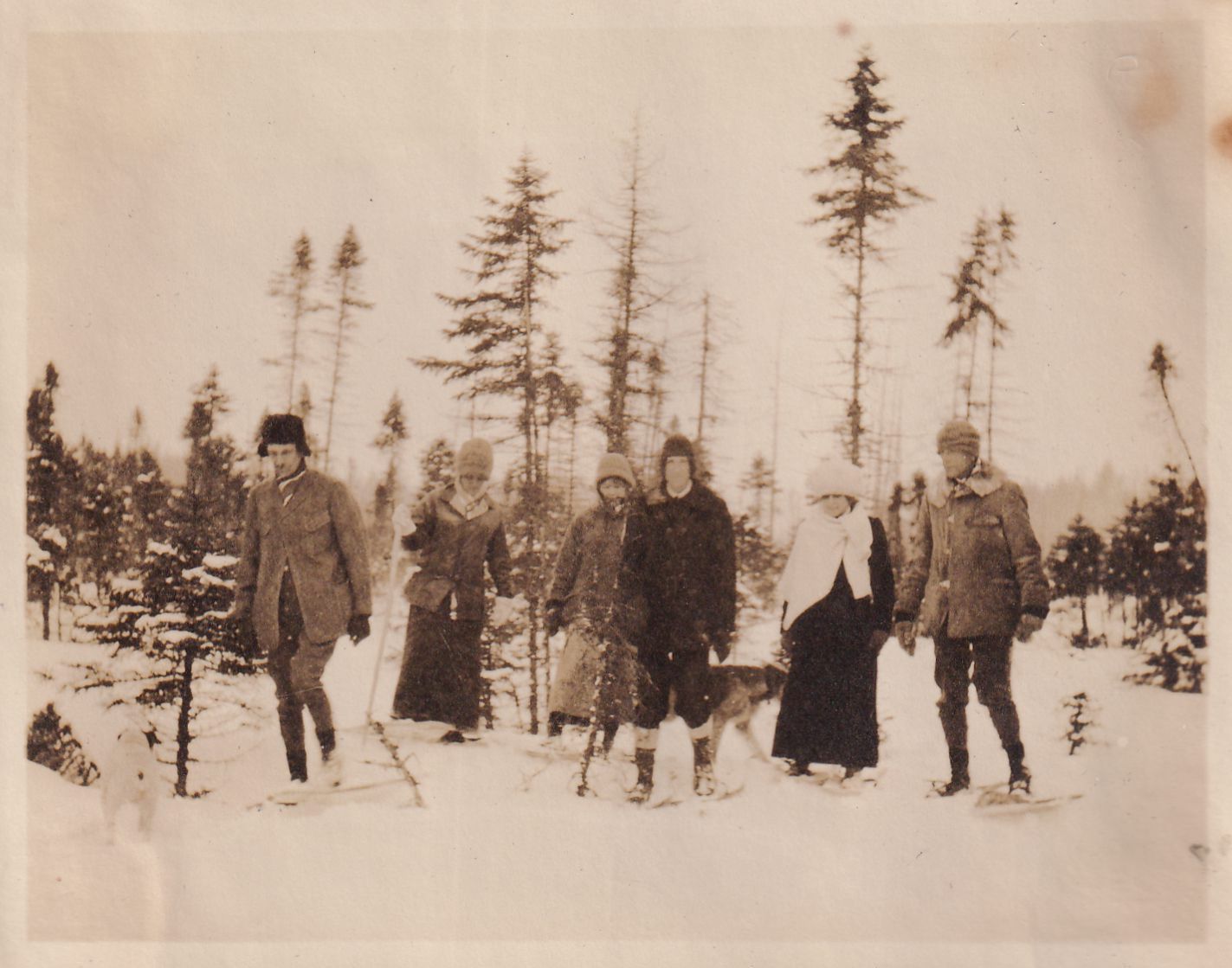 Photograph of a group of unidentified men and women standing in the woods on snowshoes.