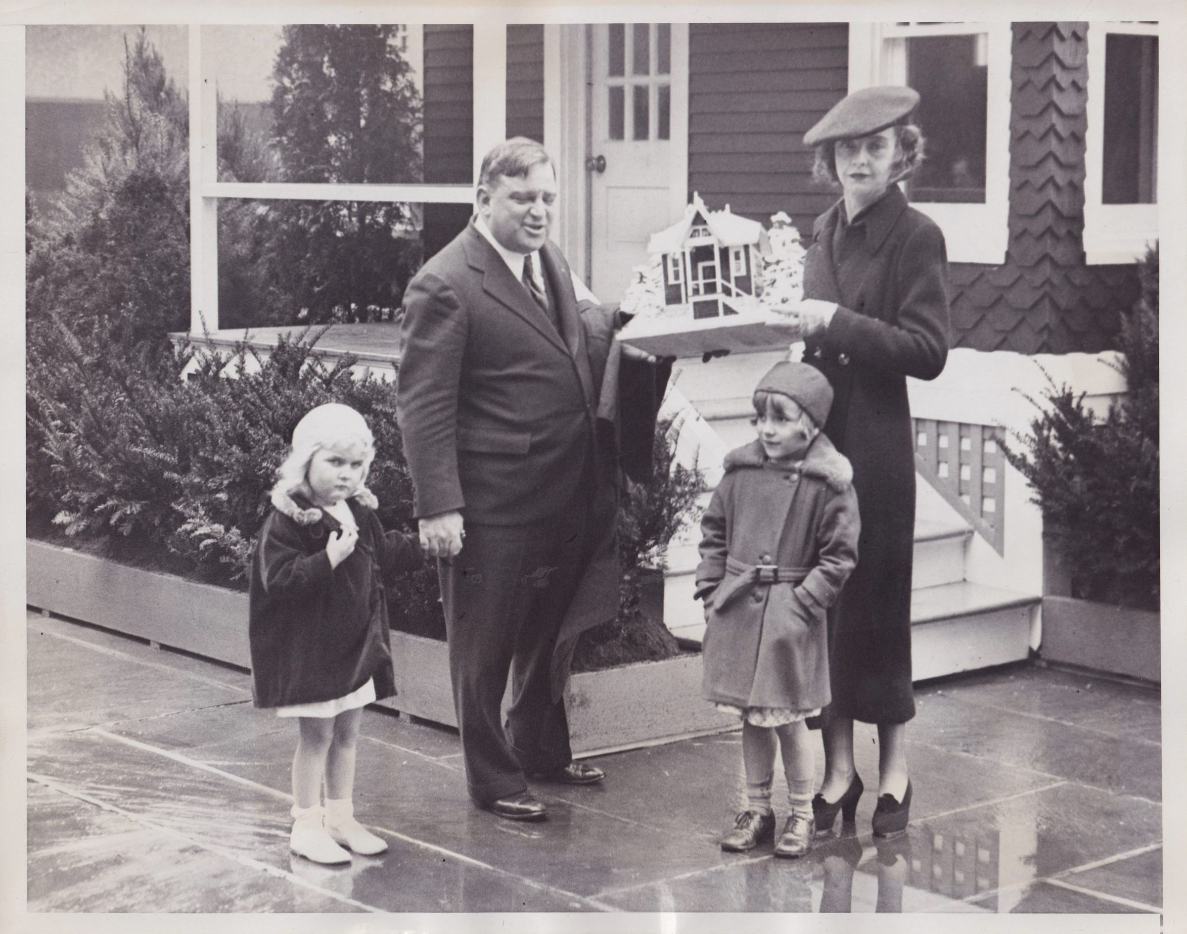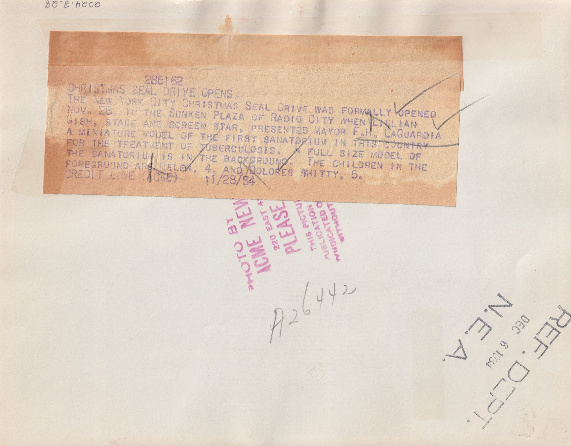 Black-and-White photograph showing Mayor LaGuardia and Lillian Gish standing with two young girls. LaGuardia and Gish are holding a small scale model of Little Red between them, and a portion of a life-size model of Little Red is visible behind them. Typewritten caption taped to back reads, "Christmas Seal Drive Opens. The New York City Christmas Seal Drive was formally opened Nov. 28, in the sunken plaza of Radio City when Lillian Gish, stage and screen star, presented Mayor F. H. LaGuardia a miniature model of the first sanatorium in this country for the treatment of tuberculosis. A full size model of the sanatorium is in the background. The children in the foreground are Helen, 4, and Dolores Whitty, 5. Credit Line (ACME), 11/28/34."Photograph Details