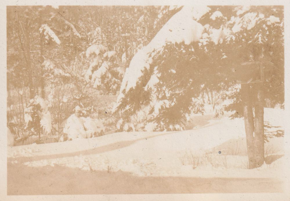 Black-and-White photograph of a snowy forest scene. Part of album 2024.21.1, kept by Amy Jones and David Blair Jones c. 1930-1934.