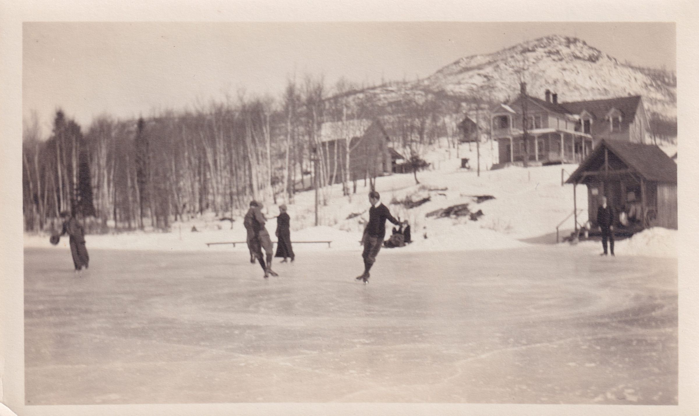 Photograph of a group of ice skaters on Moody Pond. A small hut, possible a warming or changing hut, is visible along the edge of the ice.