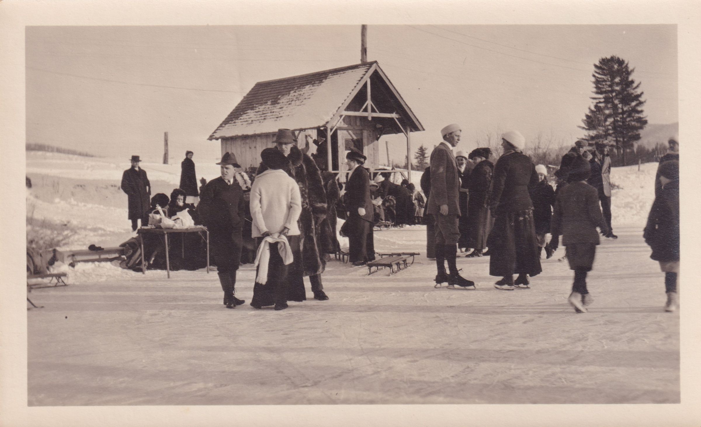 Photograph of a group of people standing on the ice on Moody Pond. Some are wearing ice skates. All are dressed in winter gear, and there are some sleds nearby. A small hut, possible a warming or changing hut, is visible in the background.Photograph Details